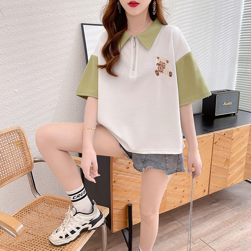 短袖T恤女设计感华夫格夏季爆款polo衫小熊刺绣插色拼接上衣