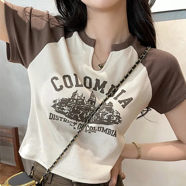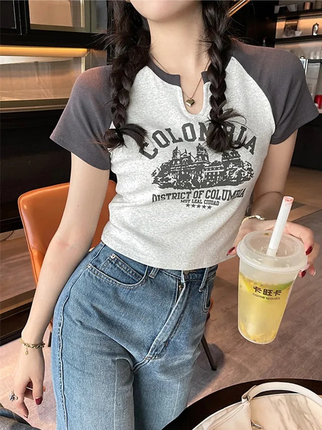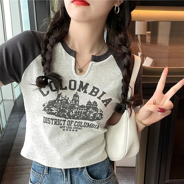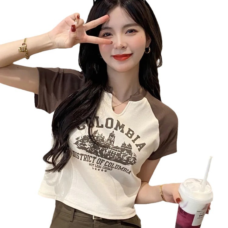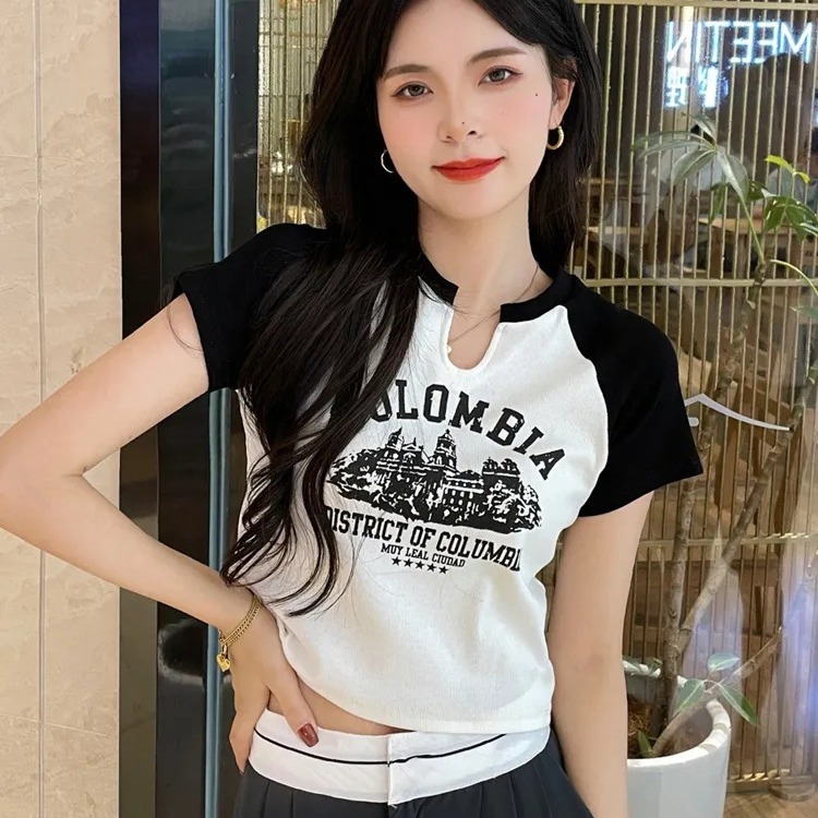 纯欲风正肩上衣夏季短袖t恤女复古美式chic甜辣妹ins潮设计感小众