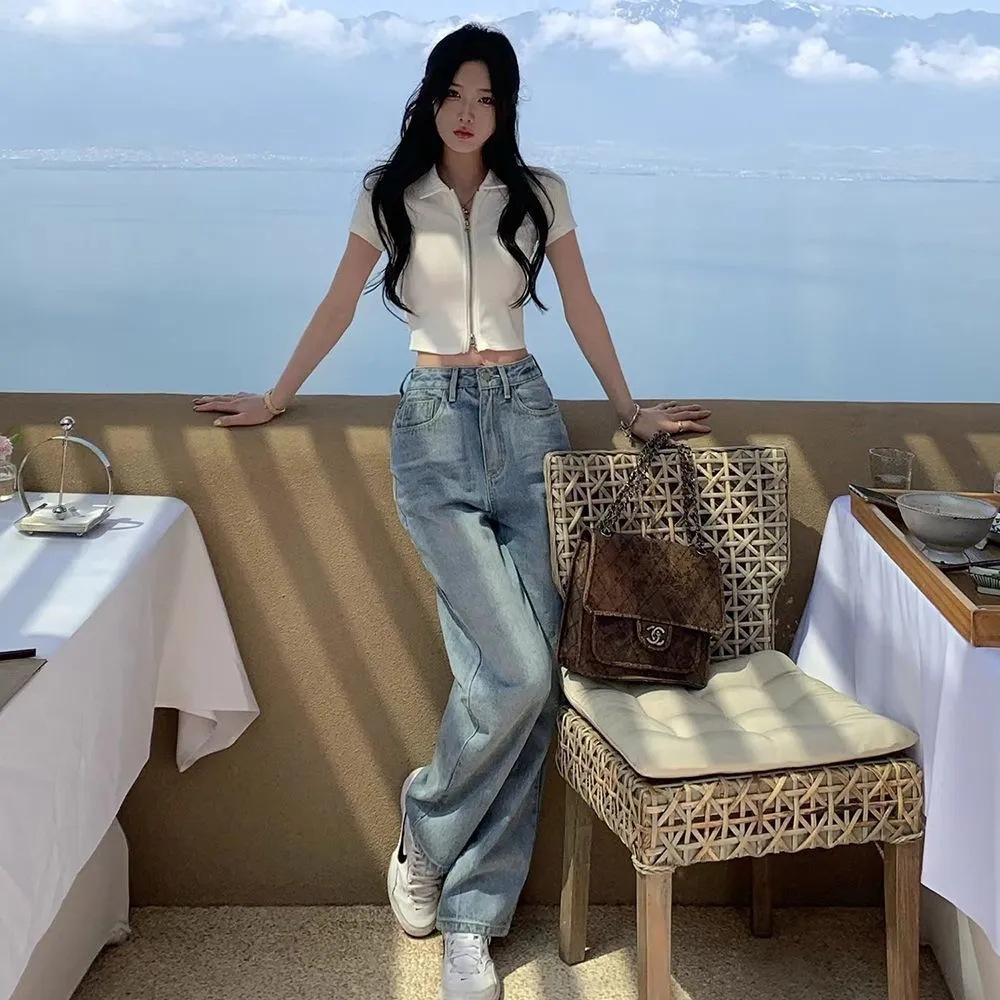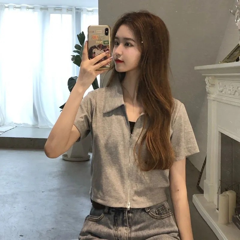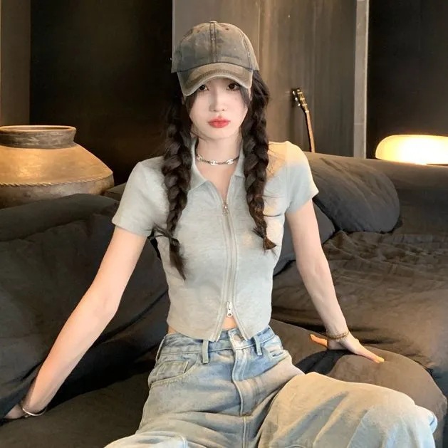 纯色双拉链polo衫短袖t恤女夏新款设计感休闲短款百搭上衣潮
