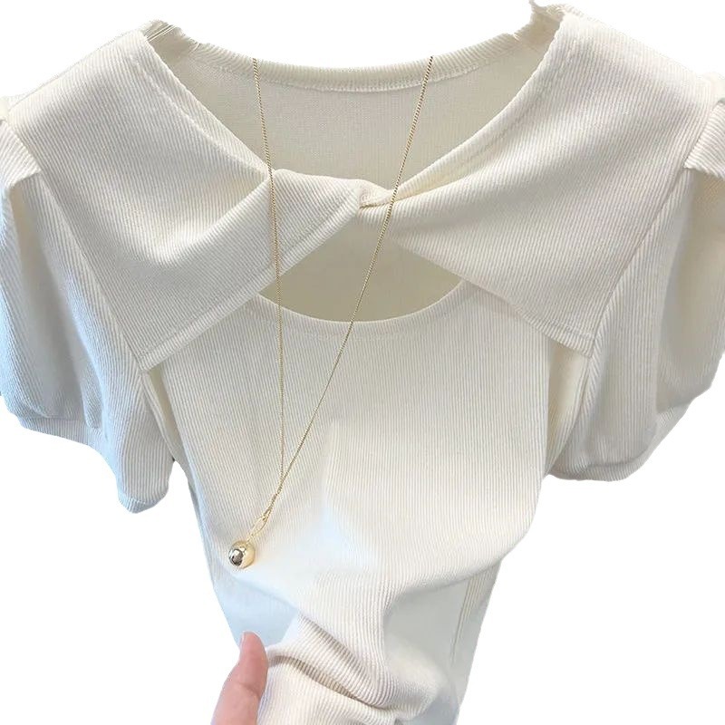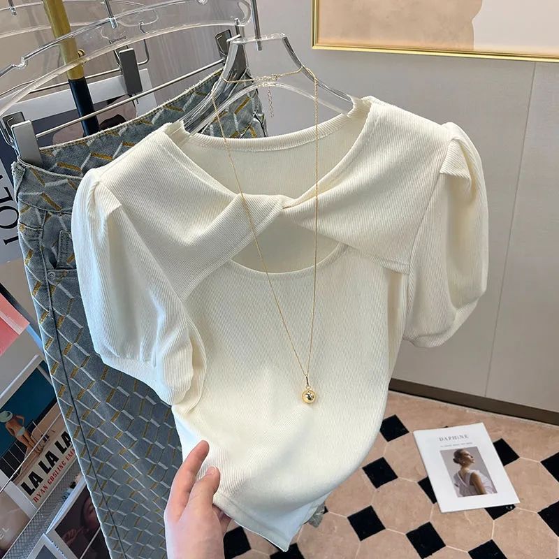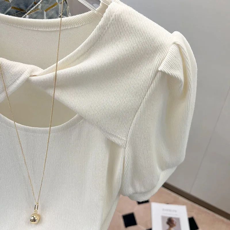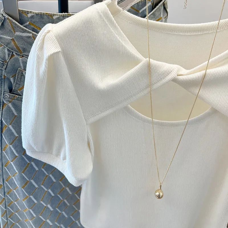 高档欧洲站绿色短袖t恤女夏季韩版新款设计感小众心机泡泡袖上衣