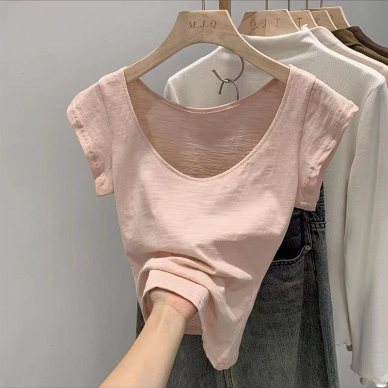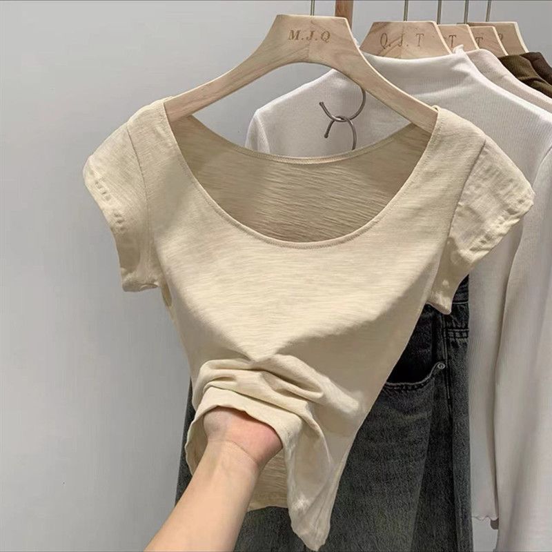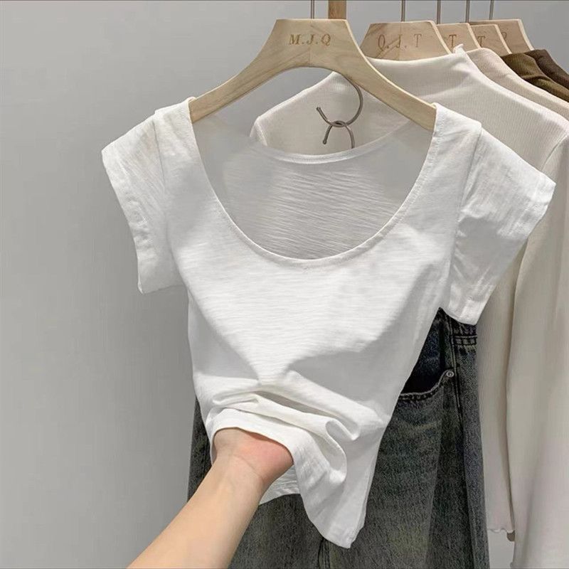 夏季100%竹节棉新款透气大u领修身圆领短袖t恤百搭显瘦u型上衣女