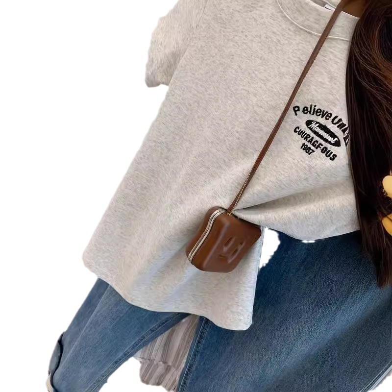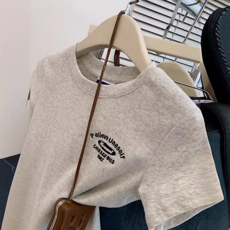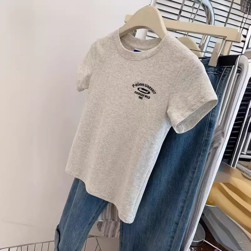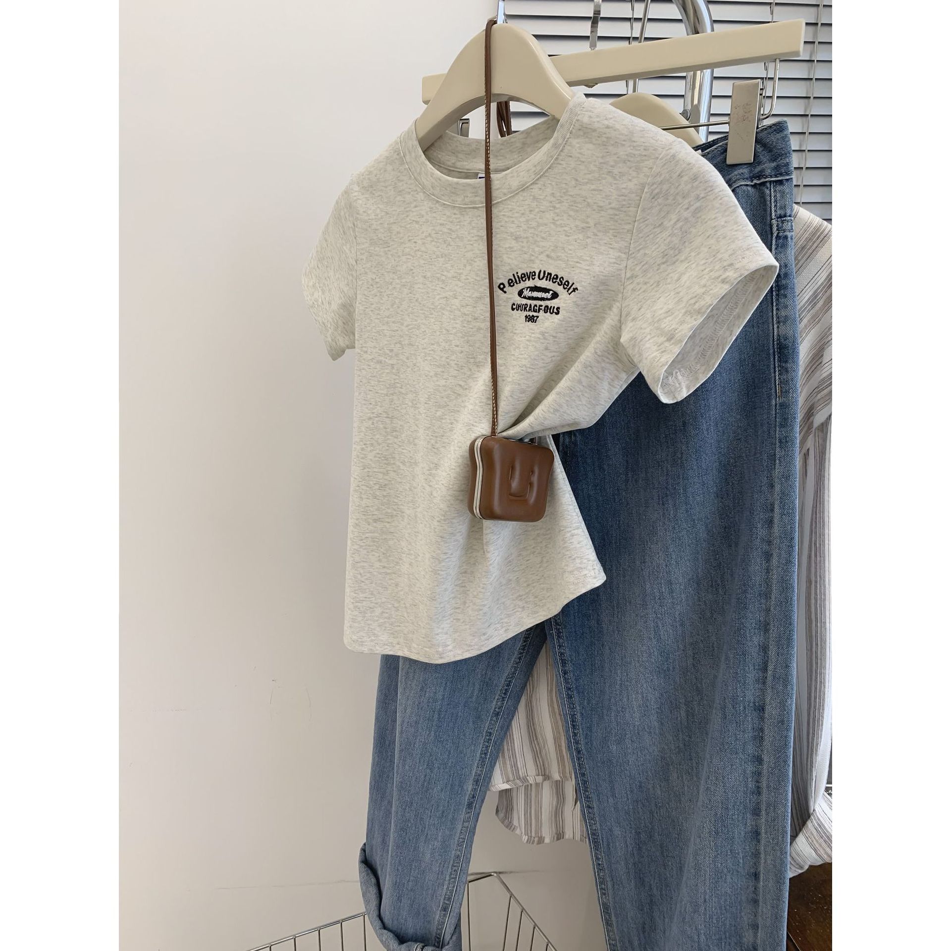 纯棉绣花灰色正肩短袖t恤女夏短款小个子设计感小众修身美式上衣