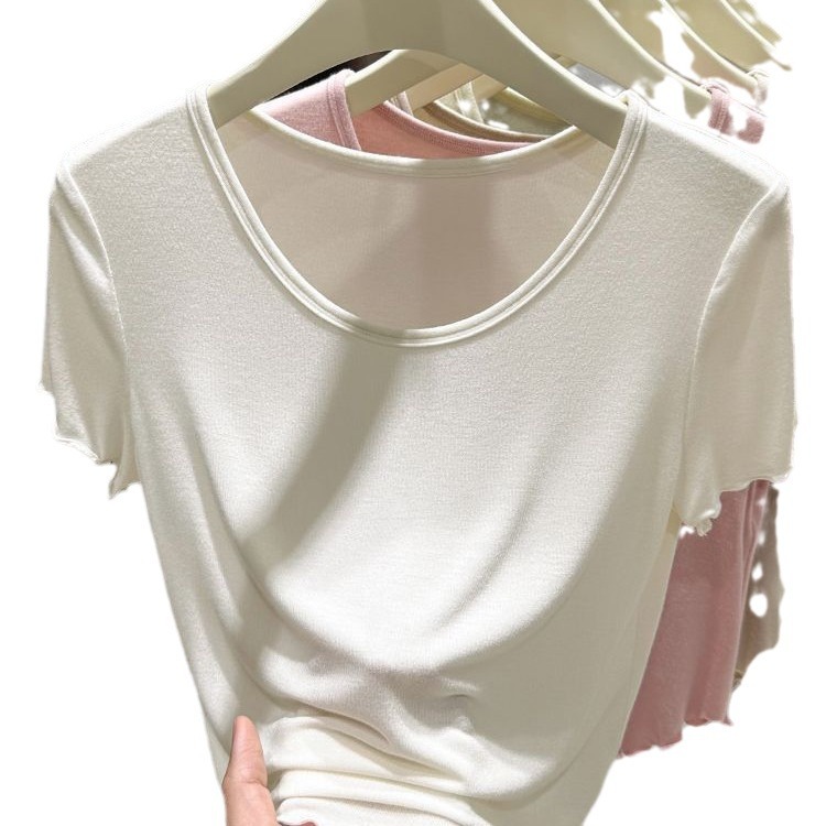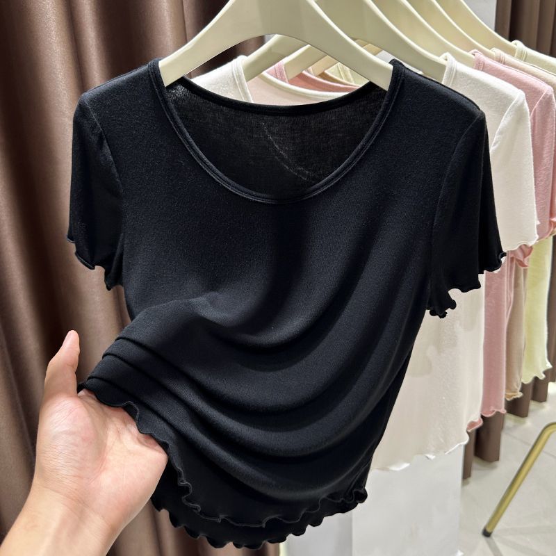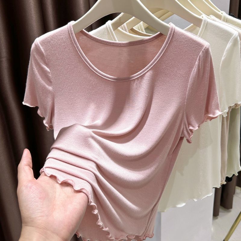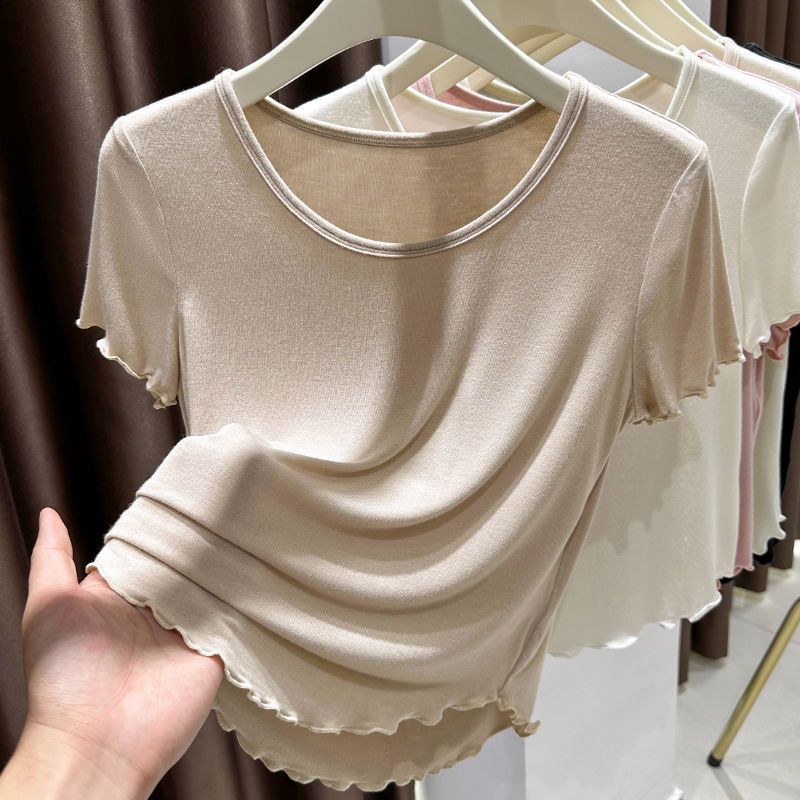莫代尔短袖t恤女夏季新款纯色大圆领木耳内搭短款打底薄上衣