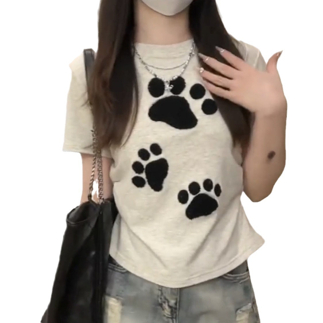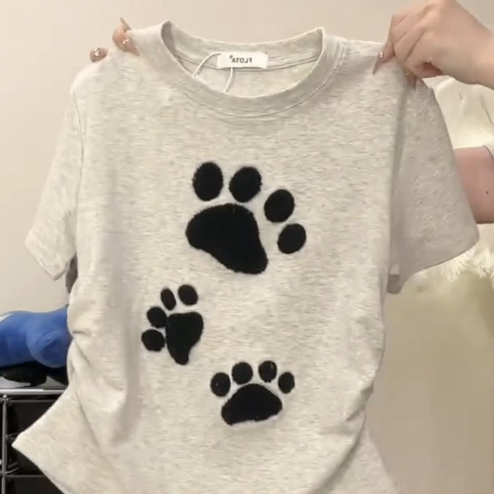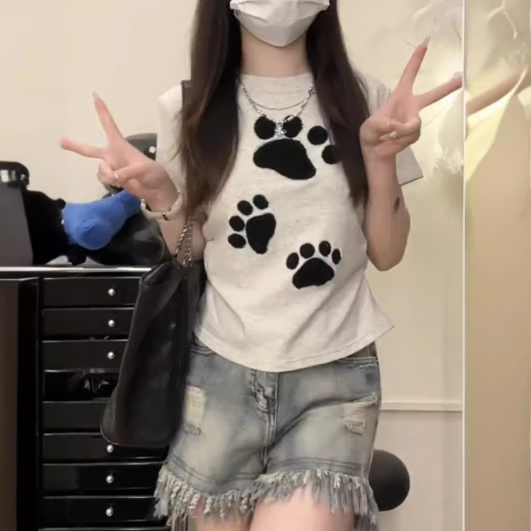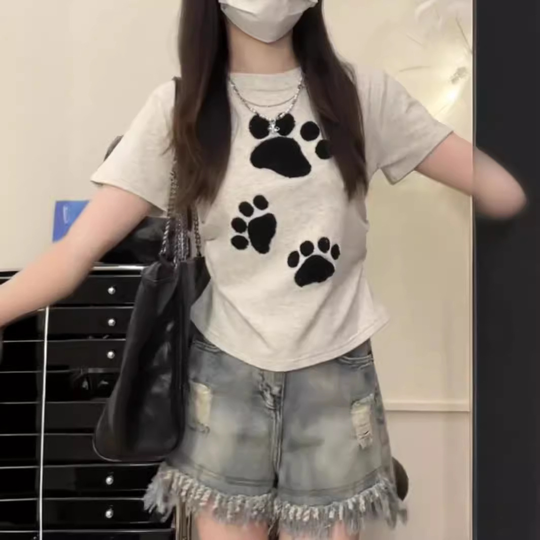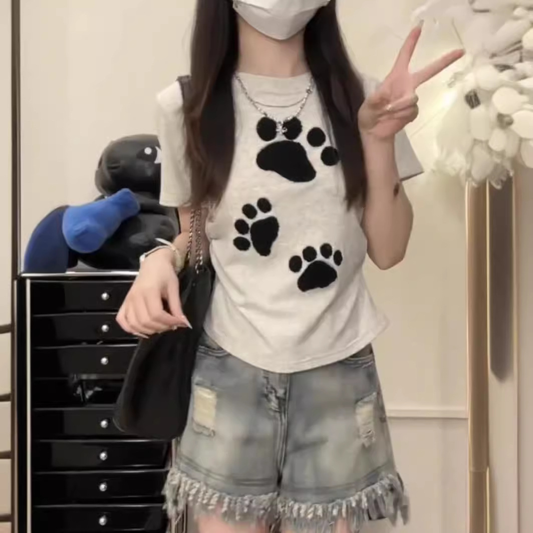 重磅100%纯棉短款短袖T恤女修身INS纯欲风可爱爪立体刺绣辣妹上衣