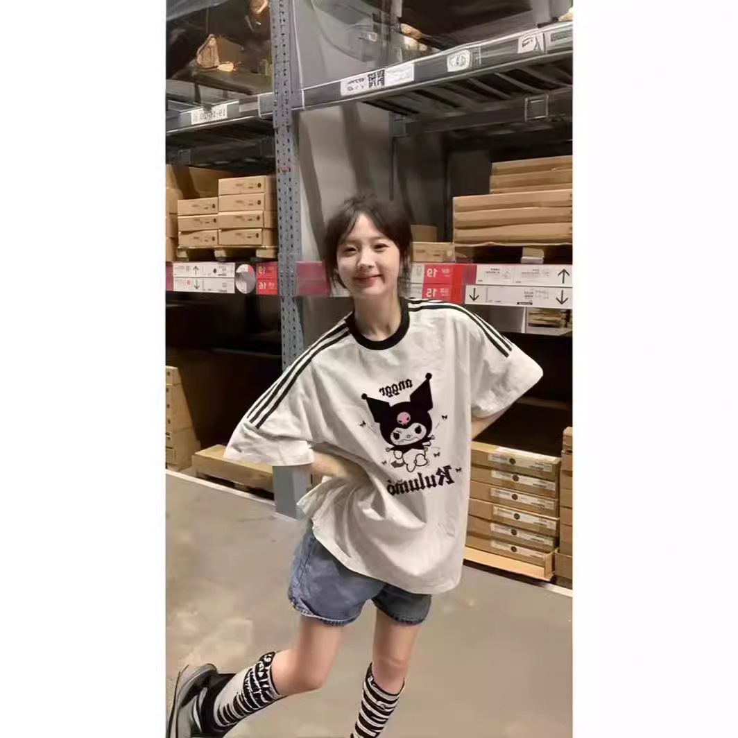 纯棉美式复古三条杠短袖T恤女夏季宽松大版库洛米卡通印花上衣服
