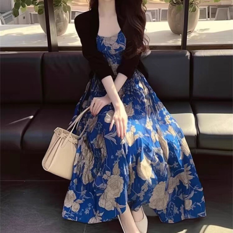 法式赫本风蓝色碎花吊带裙夏装气质名媛显瘦开衫裙子两件套装