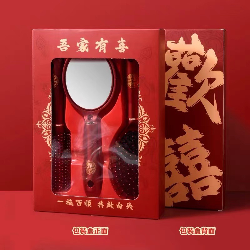 结婚梳子陪嫁婚礼红色美发梳一套按摩气垫滚梳婚嫁气囊梳镜子套装