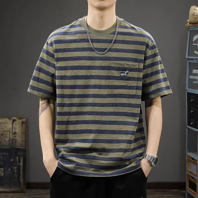 新款条纹休闲短袖T恤男复古宽松大码半袖夏季纯棉海魂衫体恤