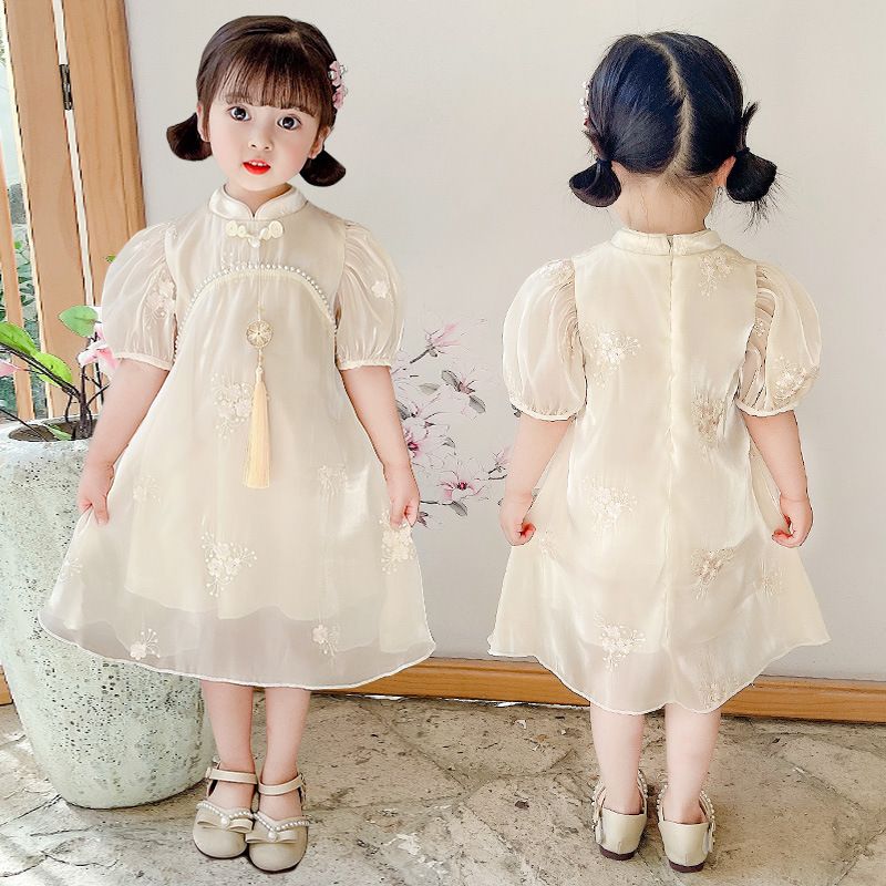 女童连衣裙新款夏季中大童墨云纱绣花旗袍裙中国风