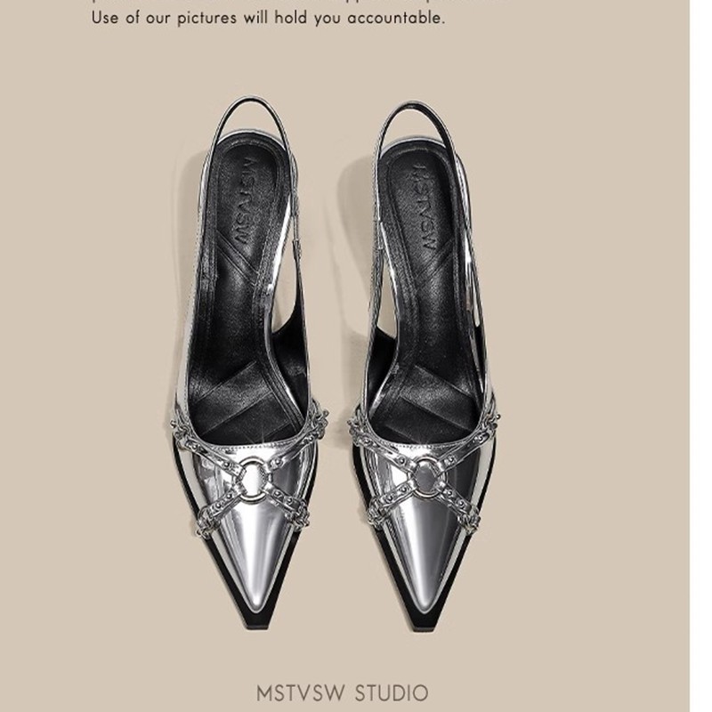 2025年法式银色气质细跟高跟鞋女尖头浅口单鞋名媛风搭扣包头凉鞋