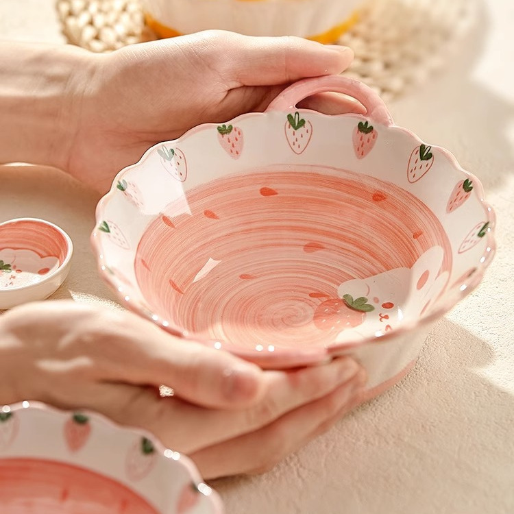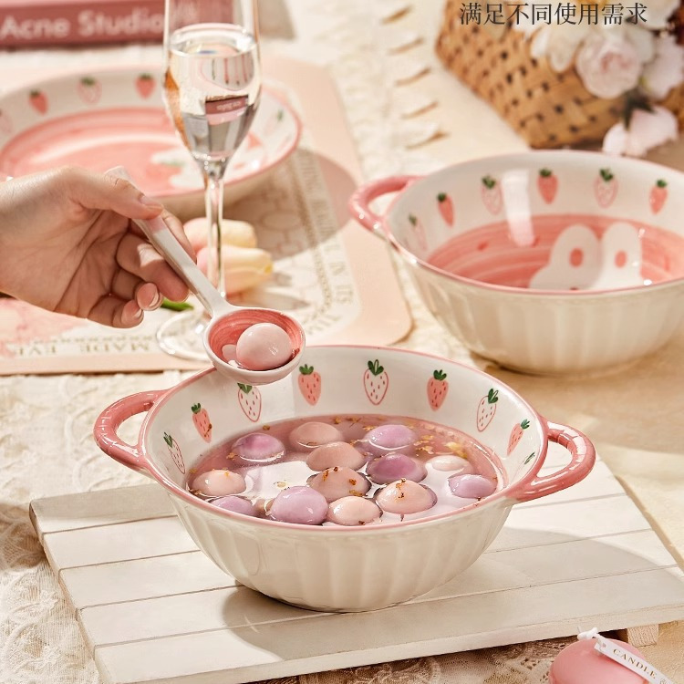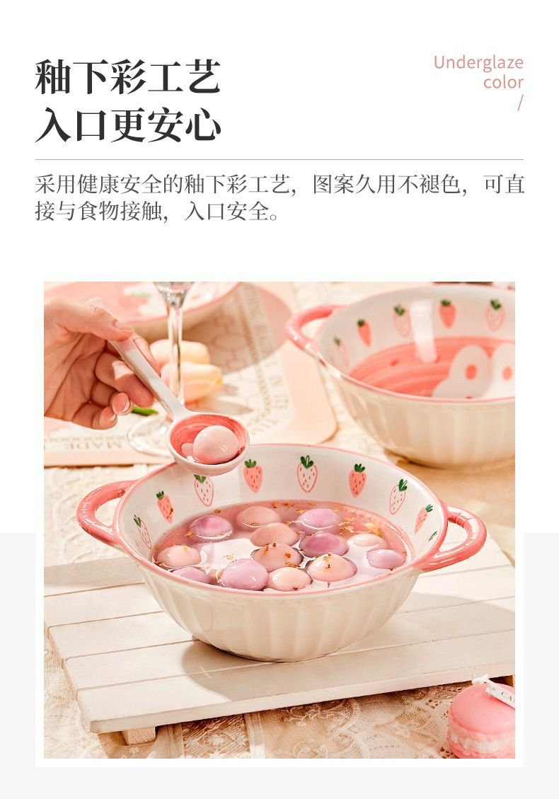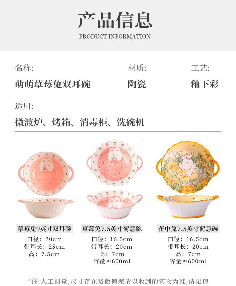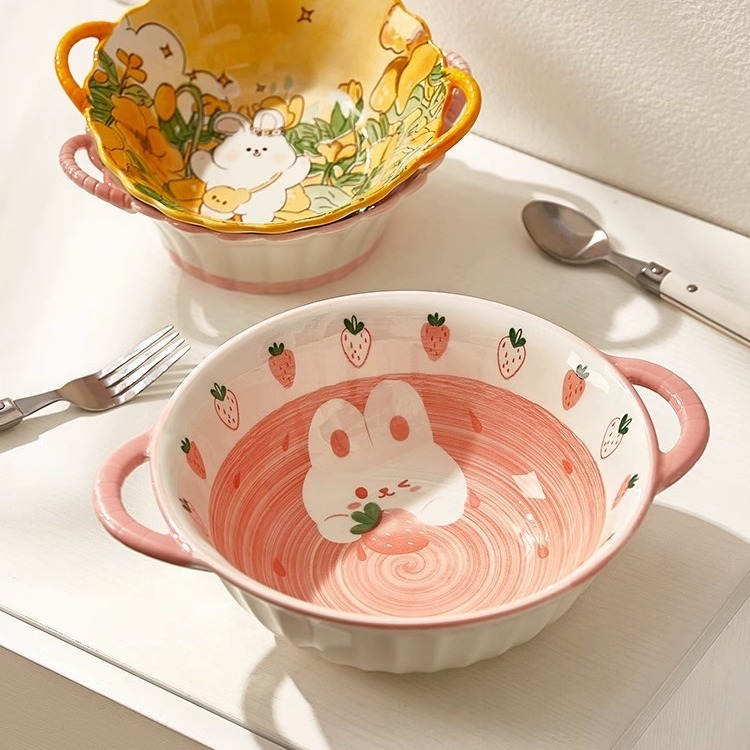陶瓷双耳汤碗家用吃面碗汤面碗可爱少女心大号草莓兔子碗