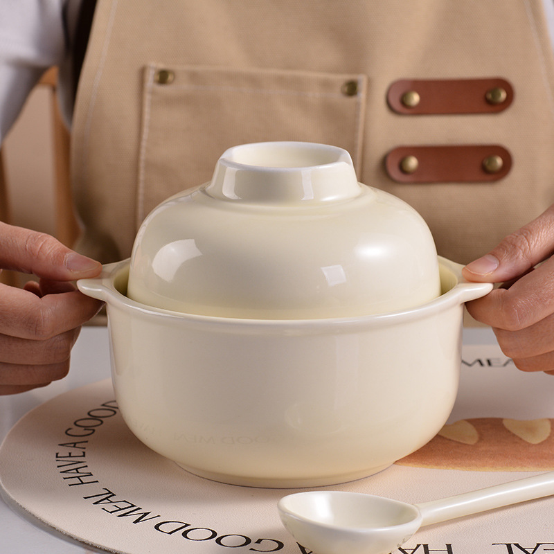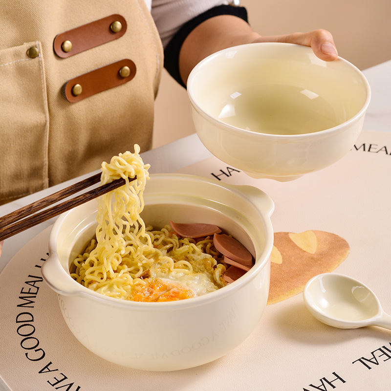 奶油风泡面碗【碗盖也是碗】+陶瓷勺+鸡翅木筷