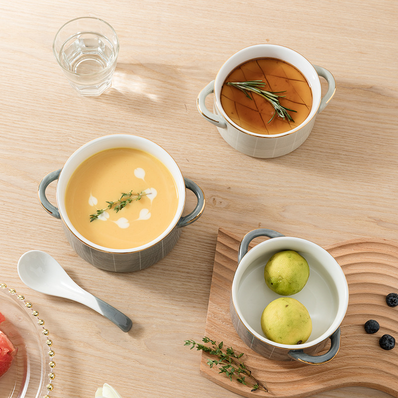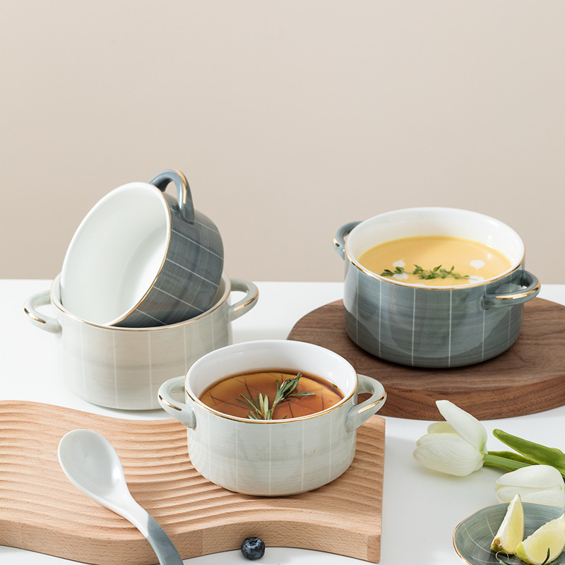 家用双耳带盖大汤碗陶瓷餐具轻奢金边欧式汤盆大号泡面碗炖盅