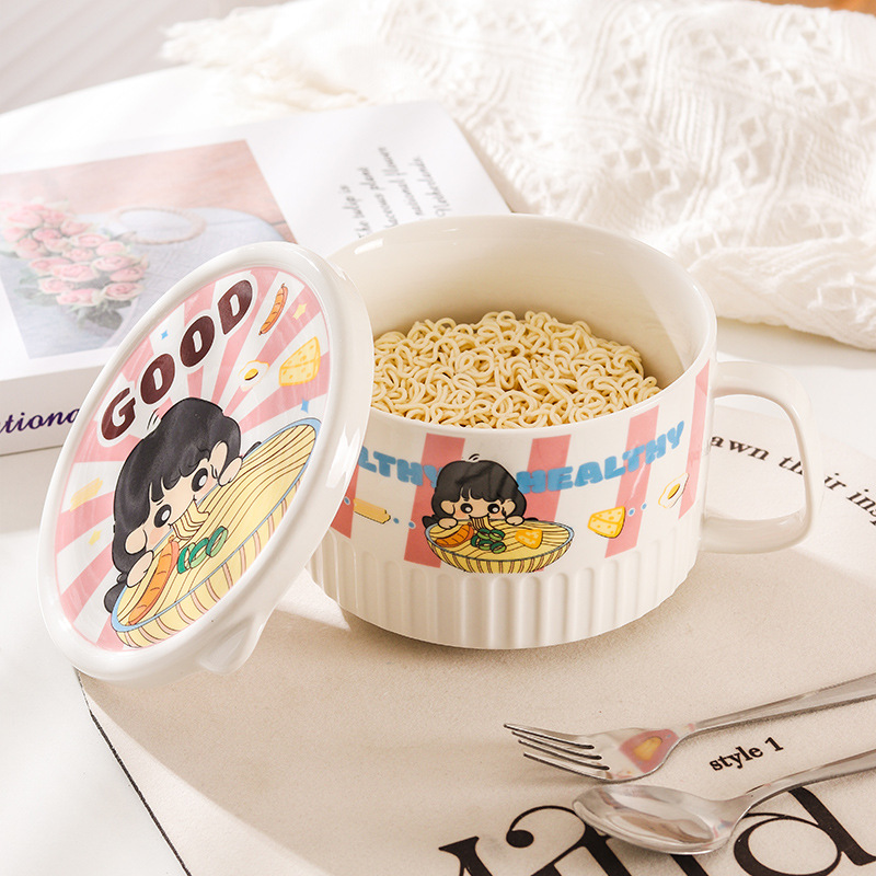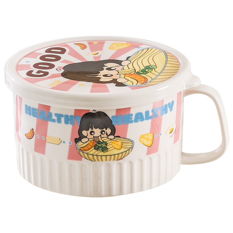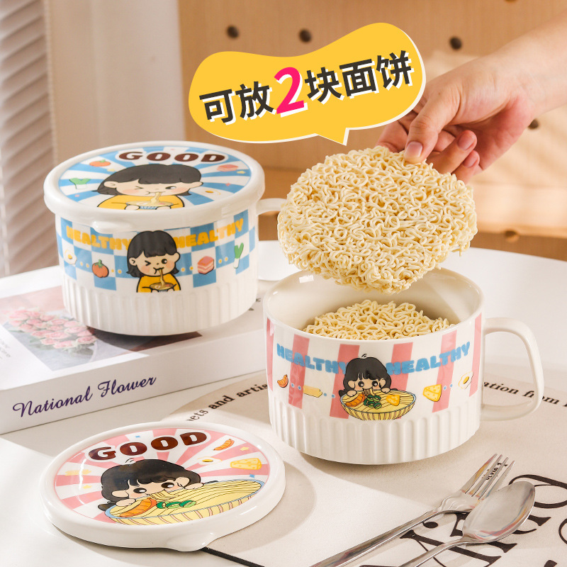 卡通陶瓷泡面碗带盖学生家用吃面碗