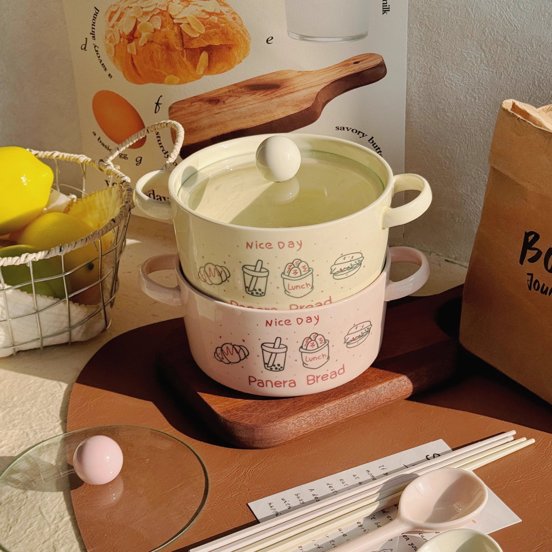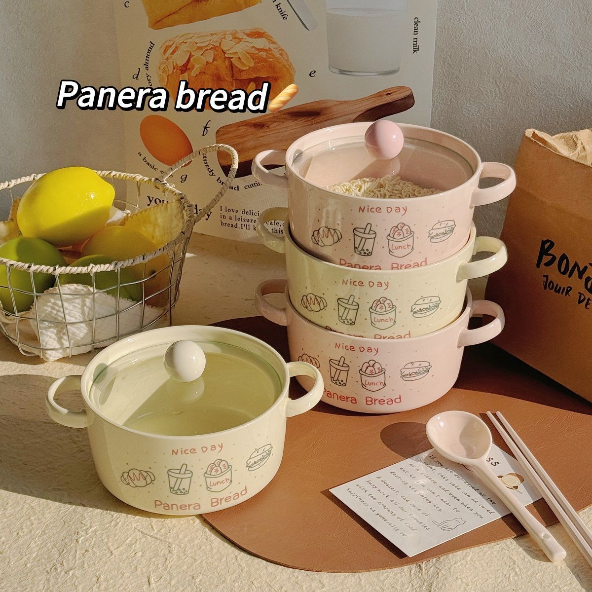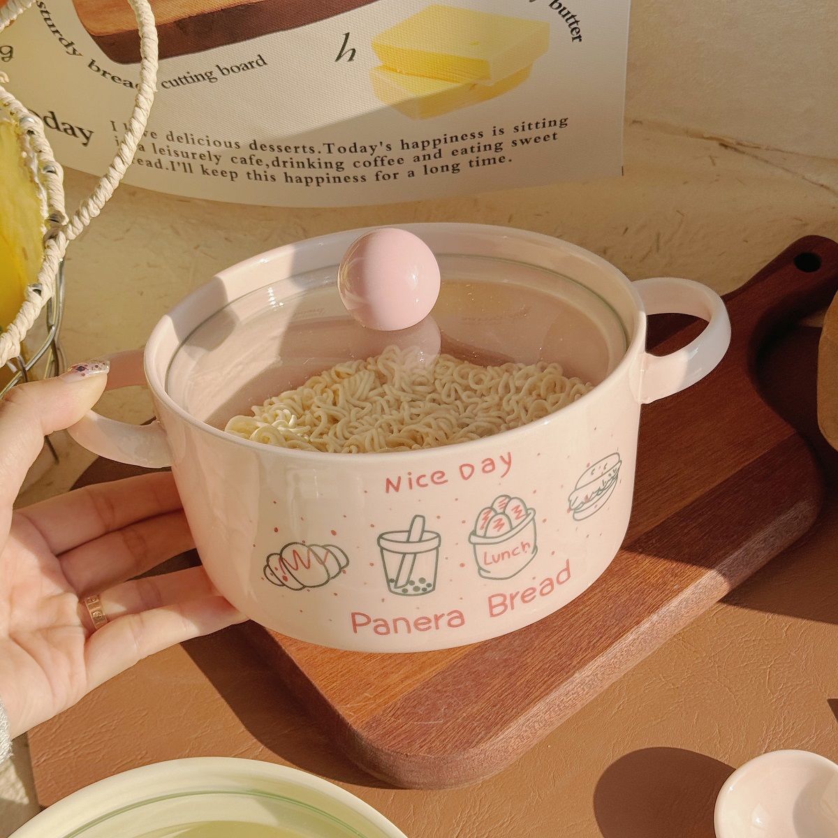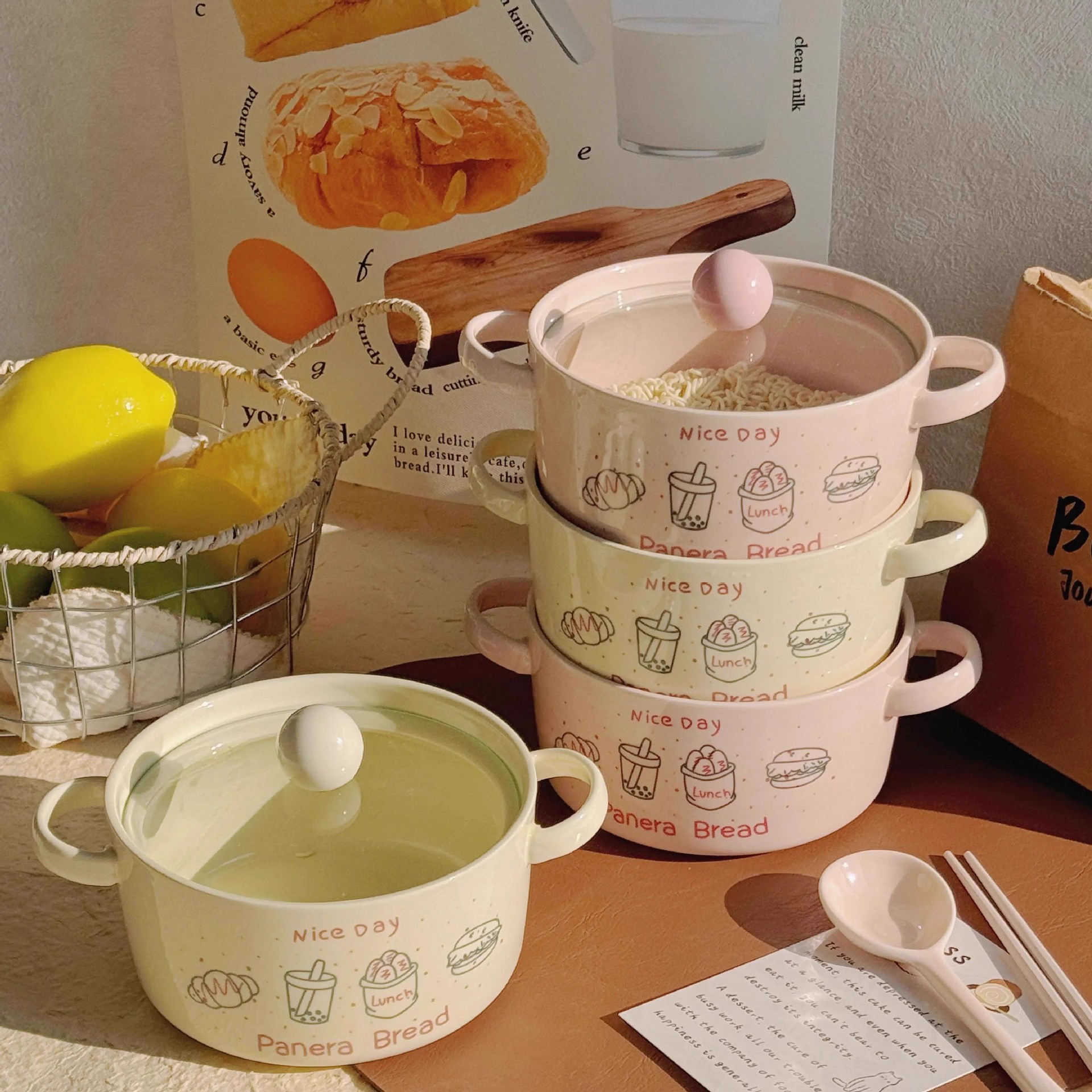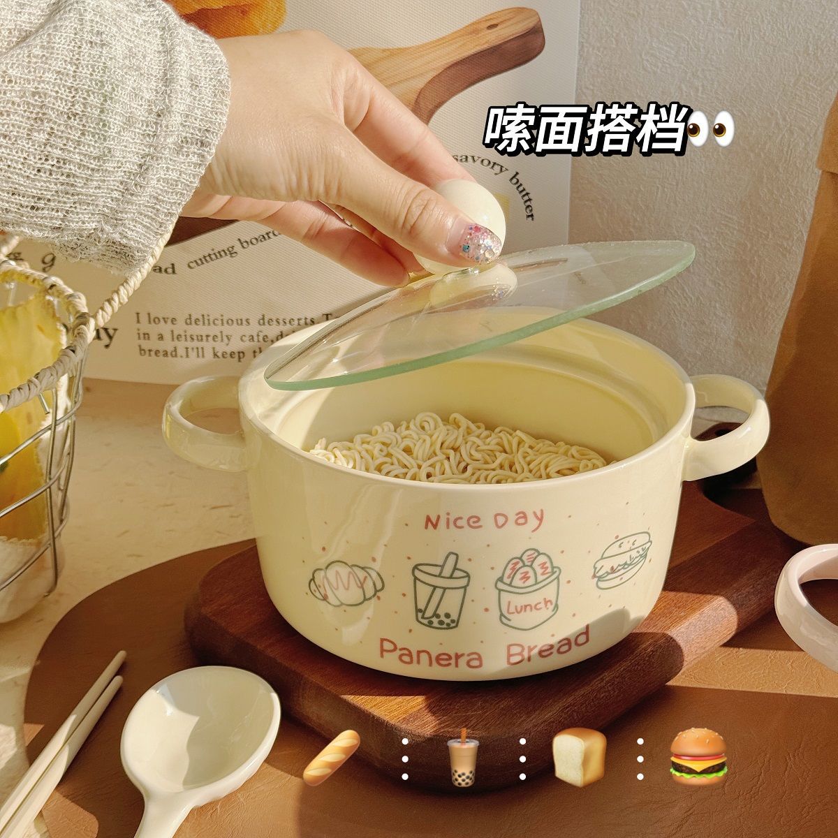 双耳面碗-奶白色(带盖)+筷子
