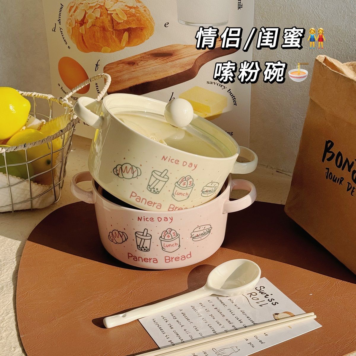 双耳面碗-奶白色(带盖)+专属勺