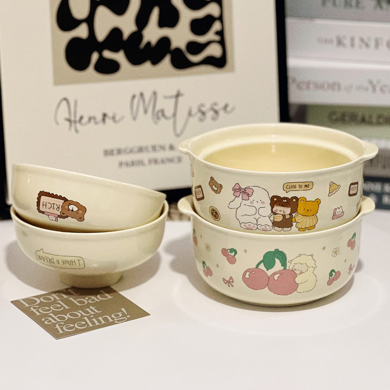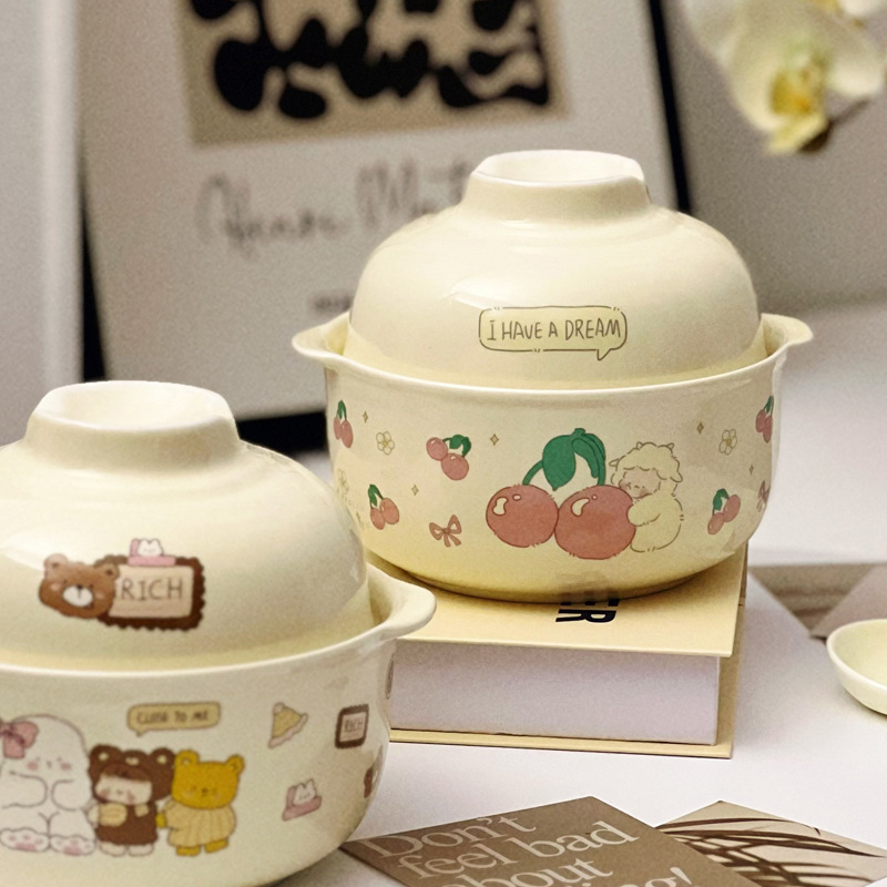 奶陶瓷水果沙拉碗双耳带盖汤碗学生宿舍可爱泡面碗一人食餐具