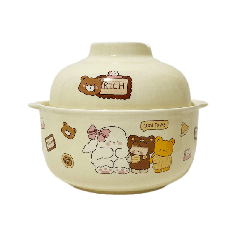 双耳碗卡通学生宿舍泡面碗陶瓷带盖泡面碗汤碗盖碗