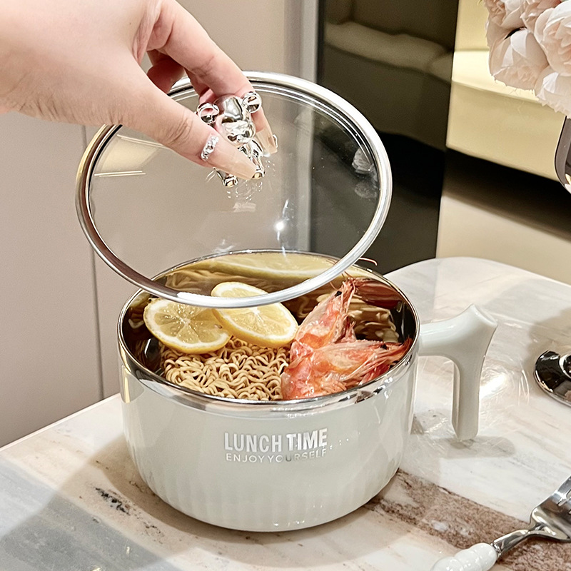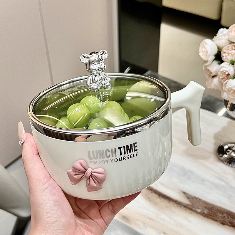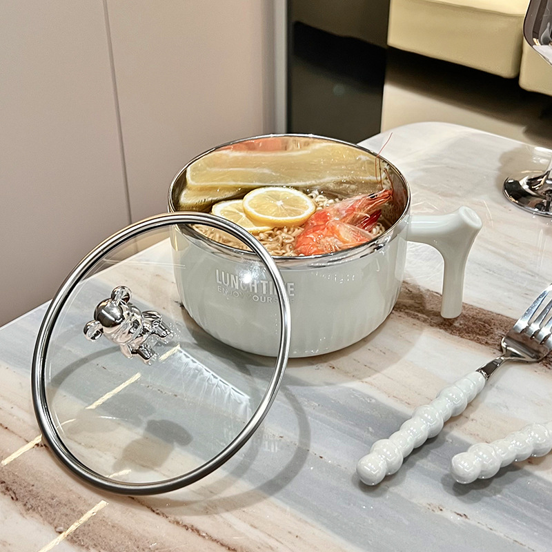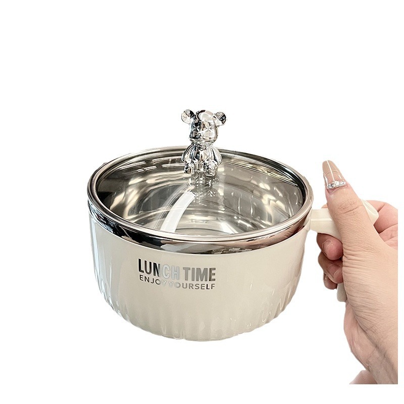 小熊奶白泡面碗不锈钢风高颜值宿舍饭碗大容量带盖带手柄汤碗