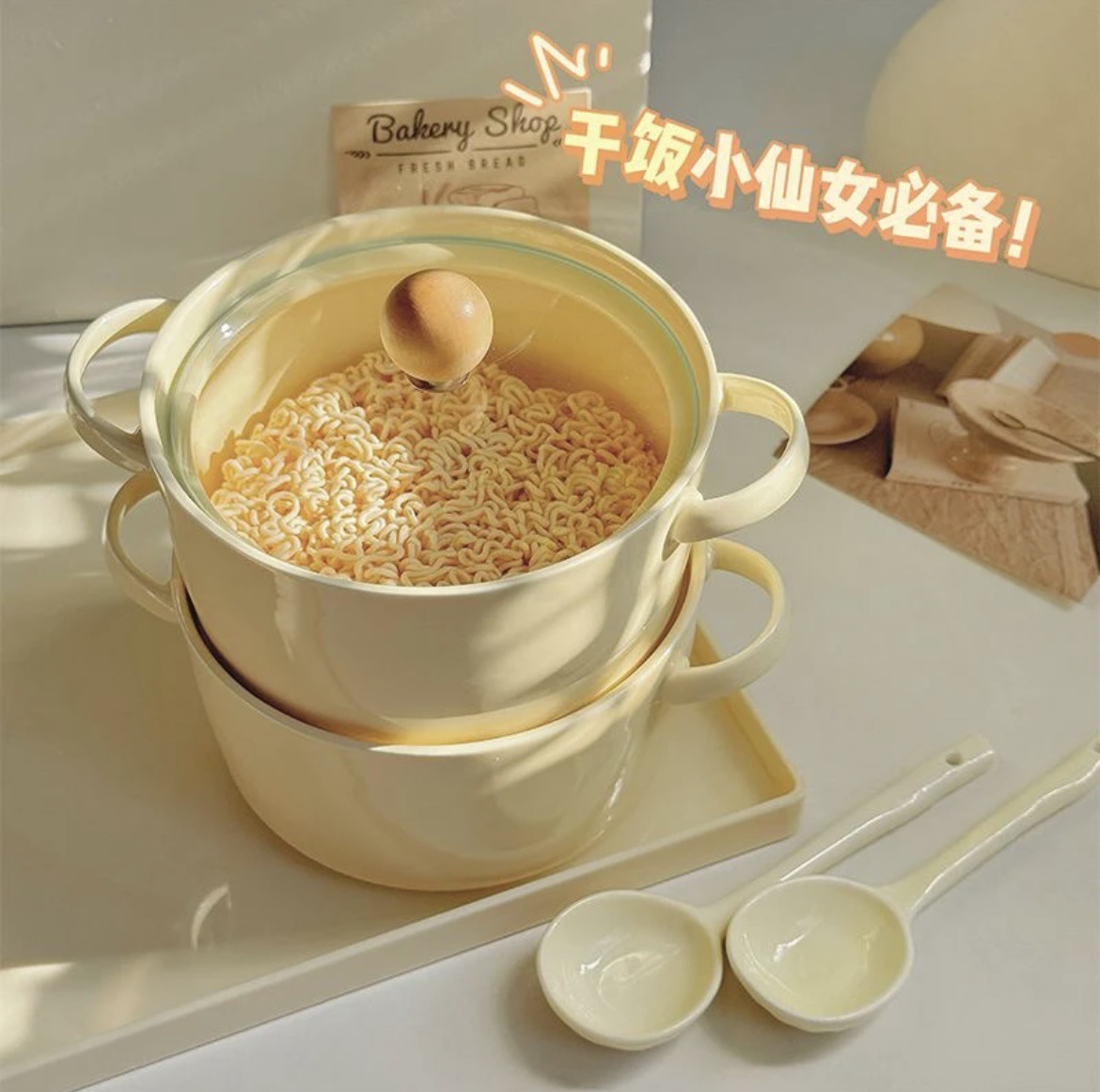 奶油风双耳泡面碗+玻璃盖+勺子【3件套】
