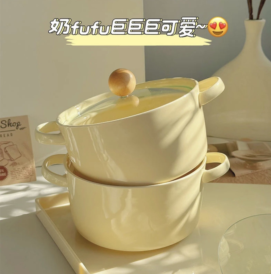 奶油风双耳泡面碗+玻璃盖【2件套】