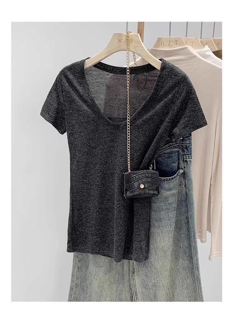 深灰色正肩大U领短袖t恤女夏新款显白基础款弹力修身显瘦上衣
