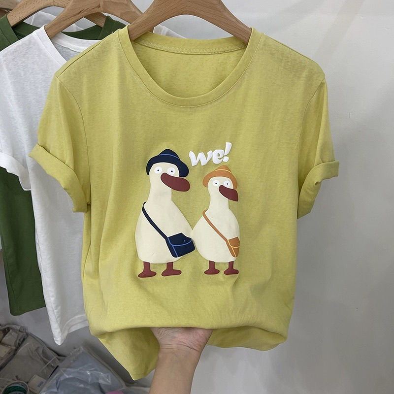 夏季新品韩版圆领宽松百搭气质鸭子洋气印花短袖T恤女小清新上衣