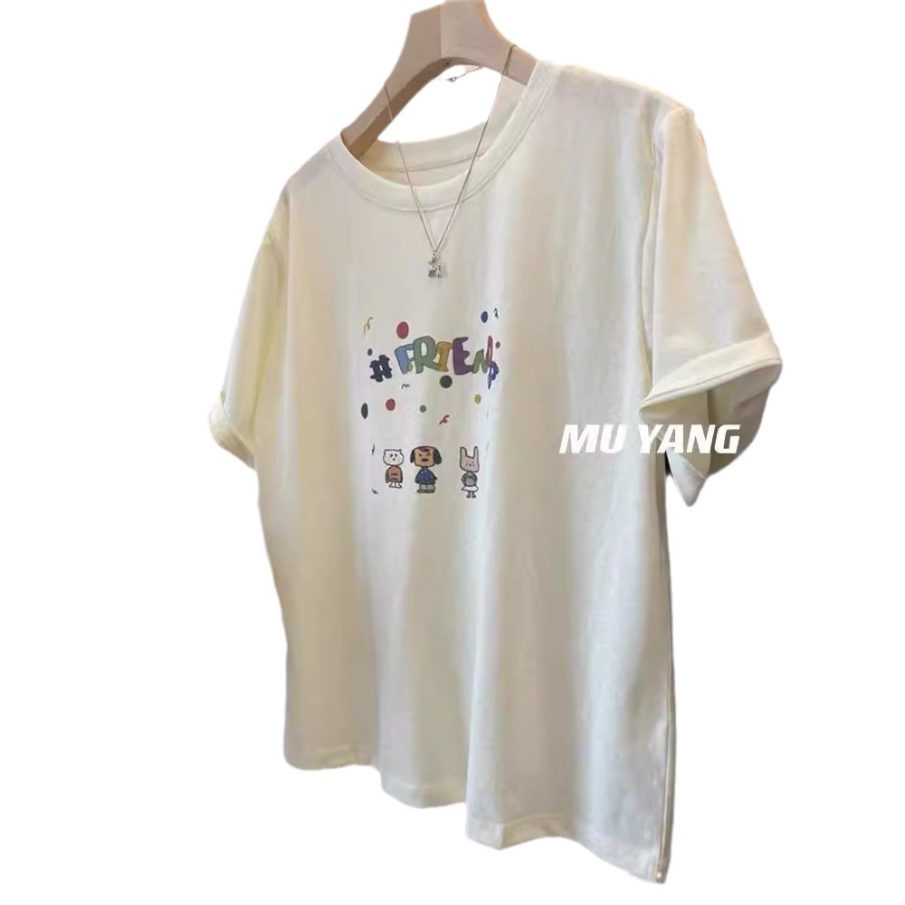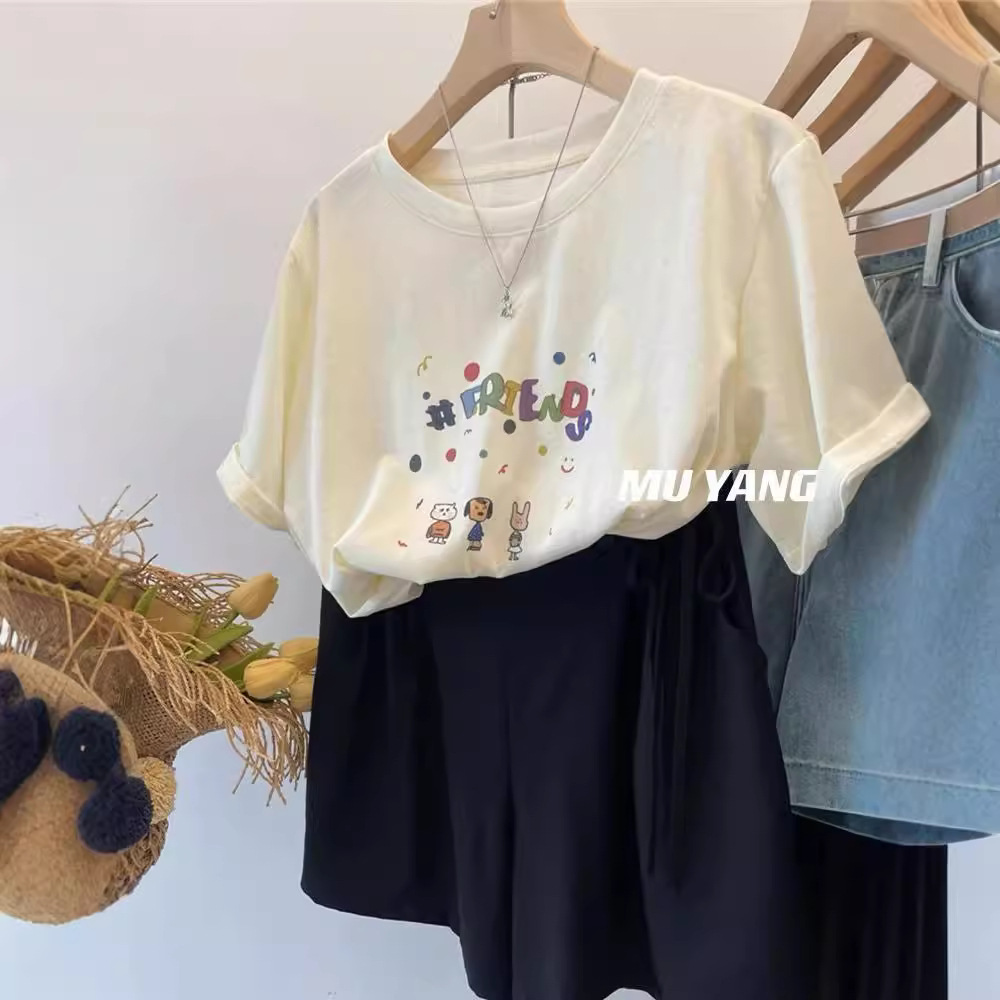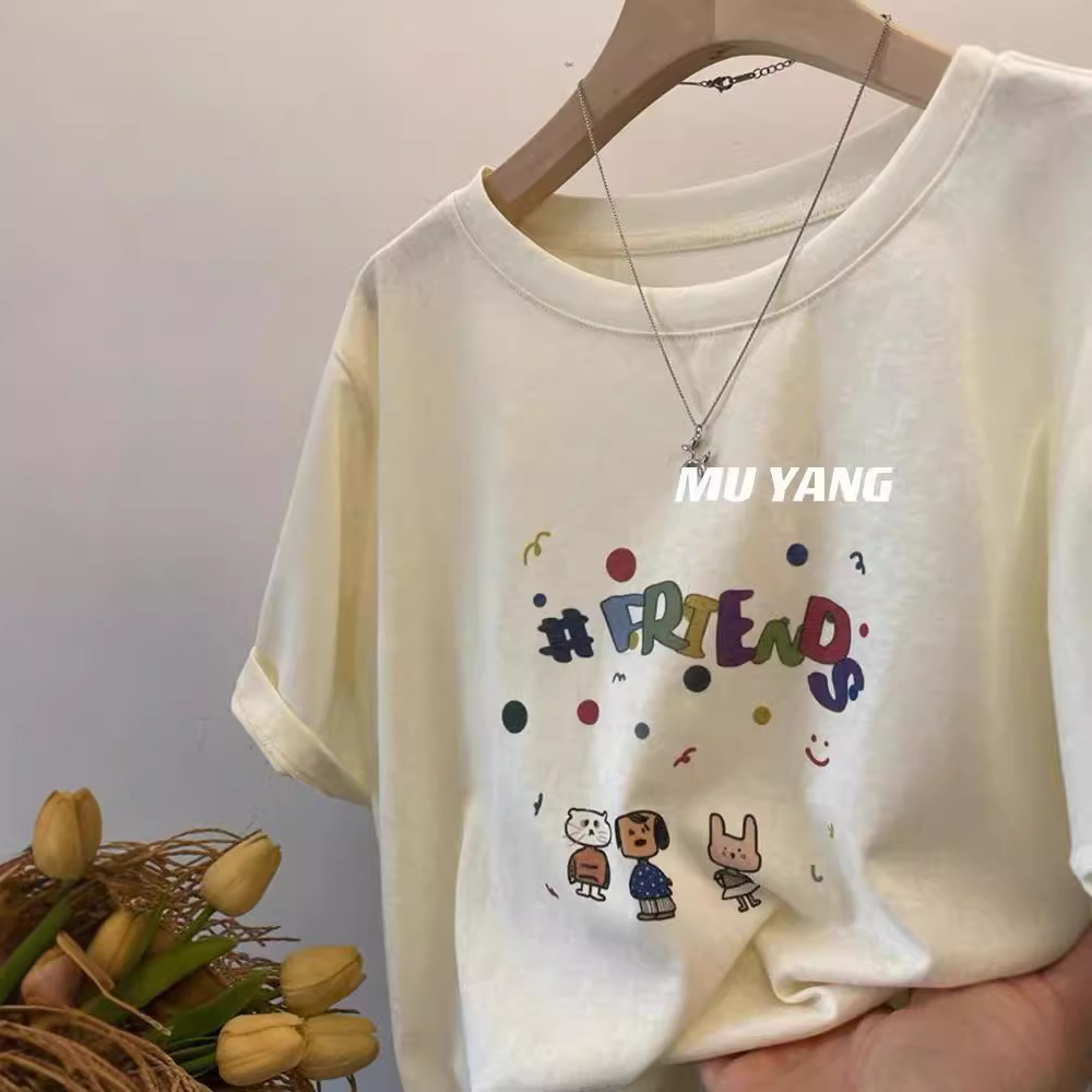 超手感莫代尔彩色音符字母印花百搭休闲小众短袖T恤半截袖上衣女