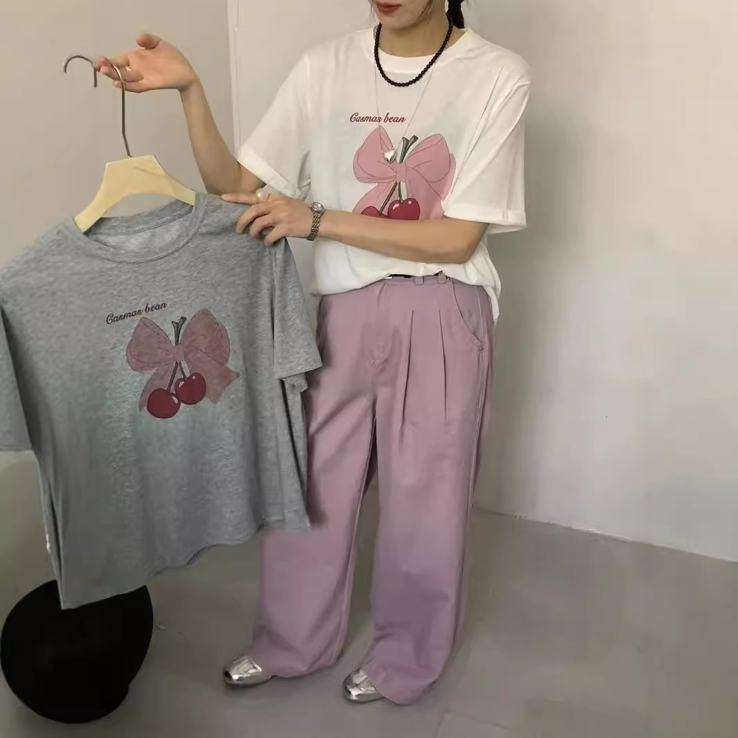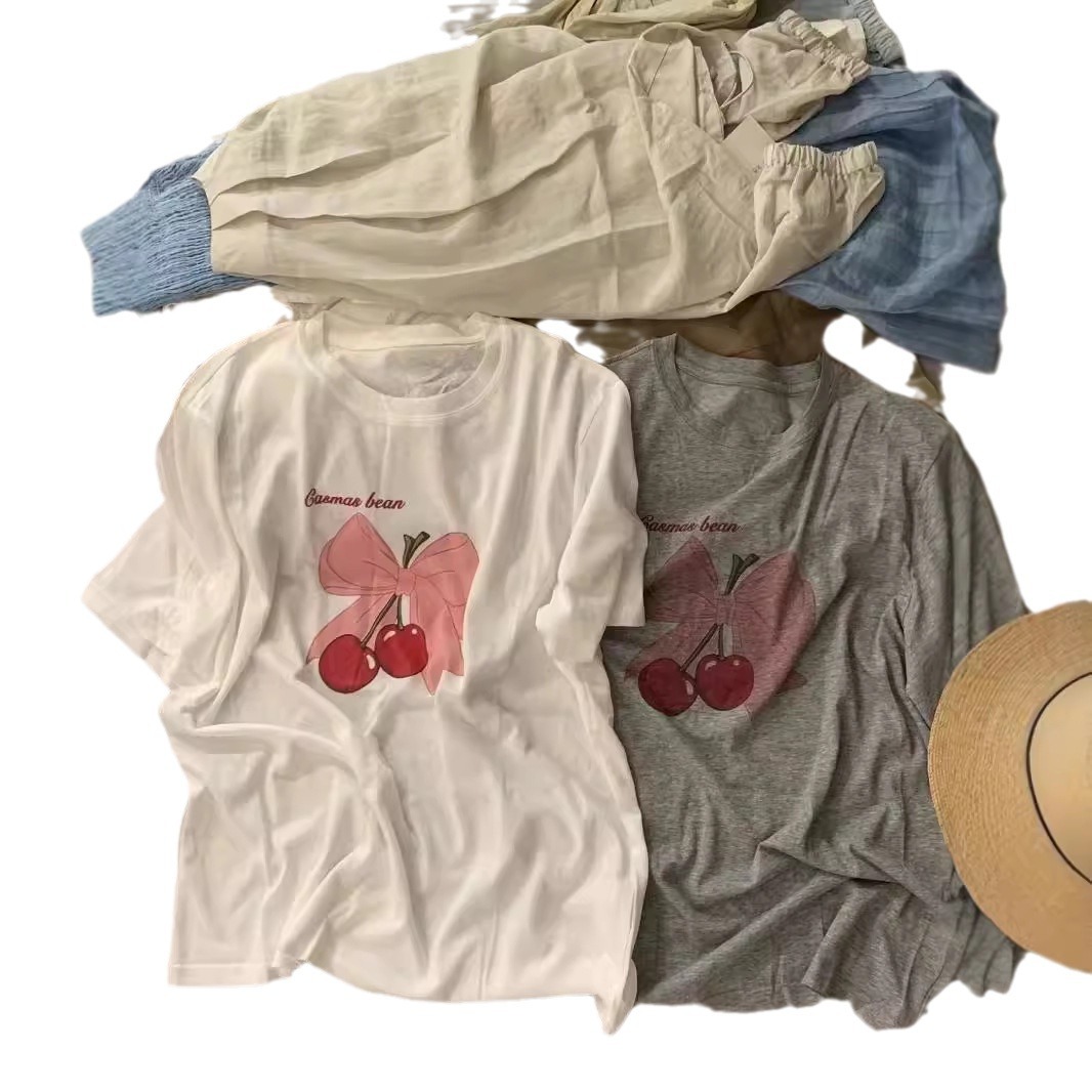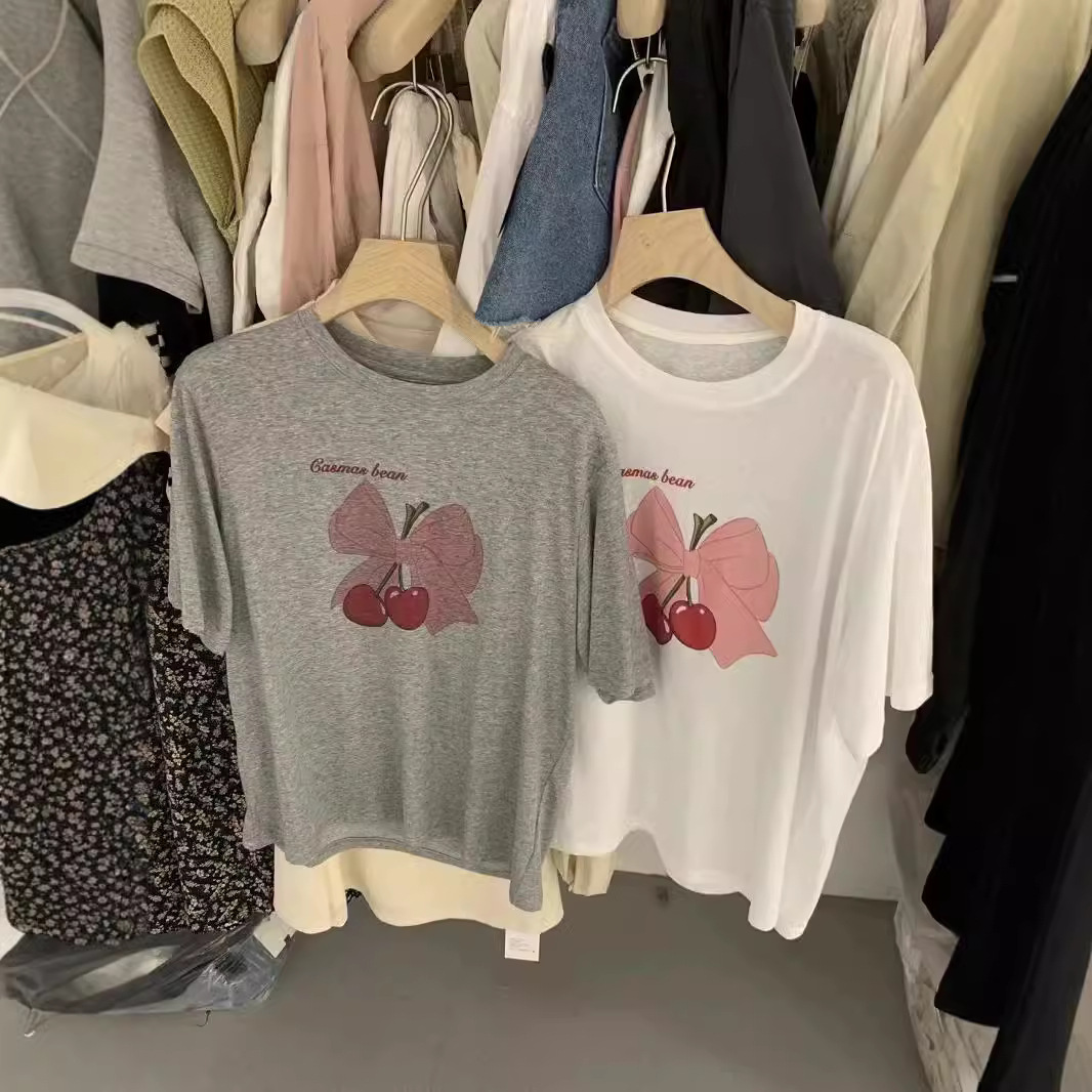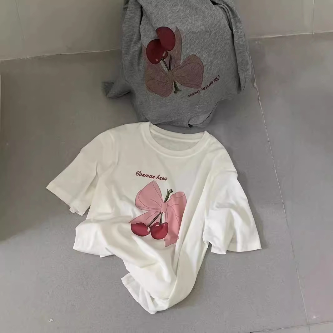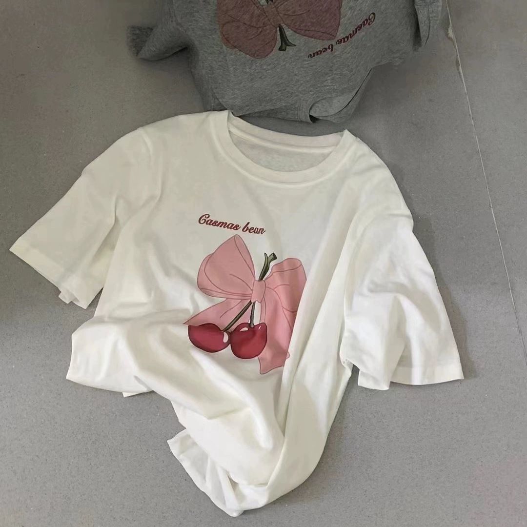 超手感莫代尔蝴蝶结樱桃印花白色短袖T恤女垂感薄款宽松体恤上衣