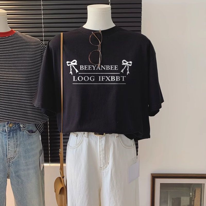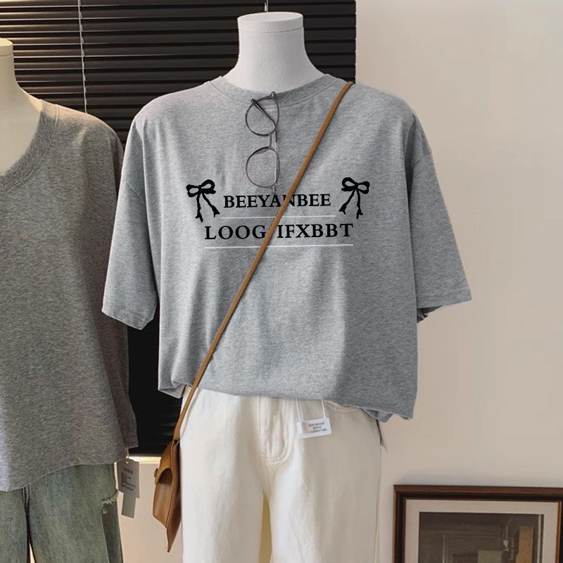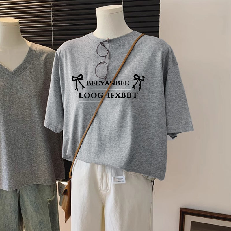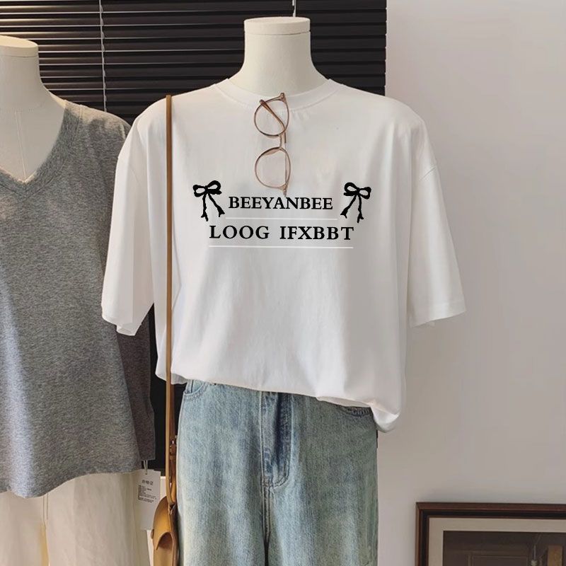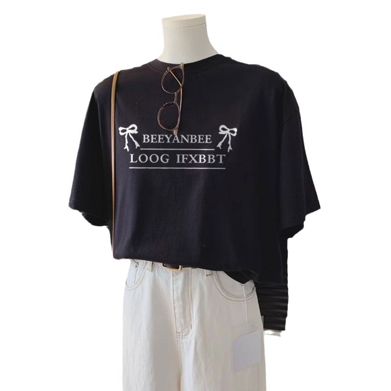 蝴蝶结字母刺绣短袖T恤女夏季新款宽松休闲百搭圆领小众上衣
