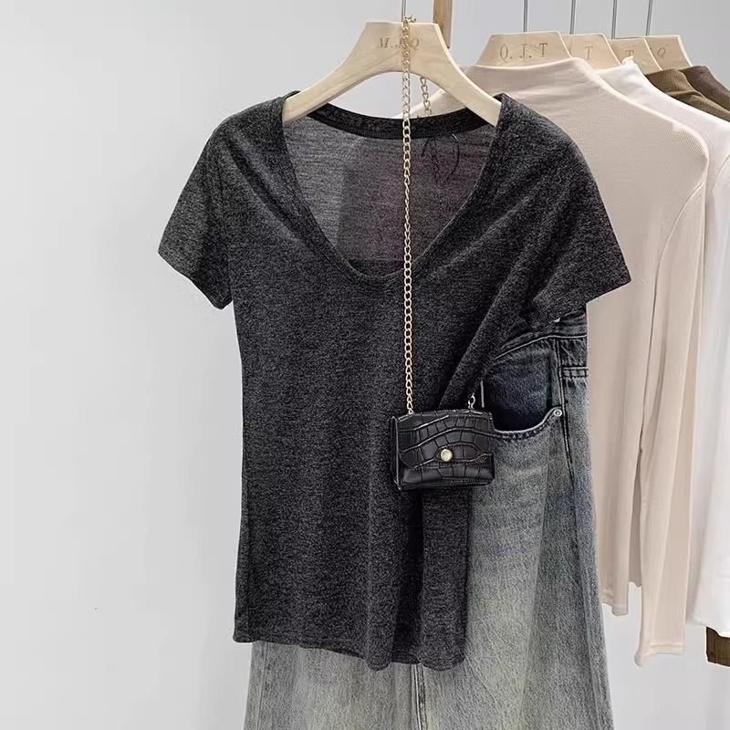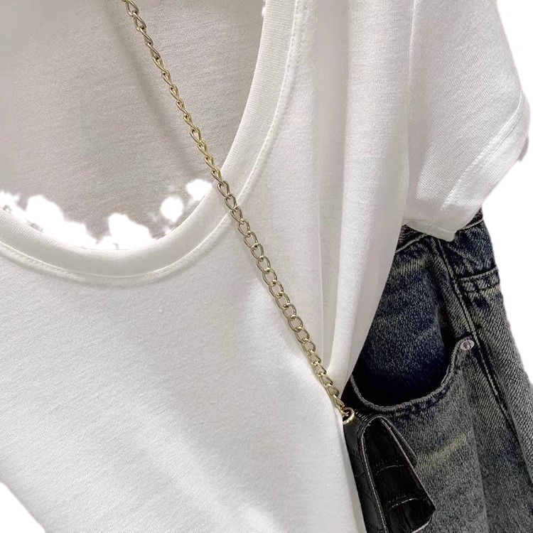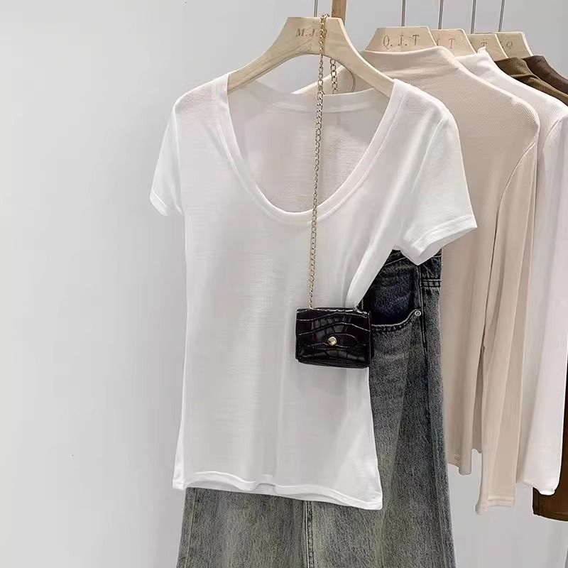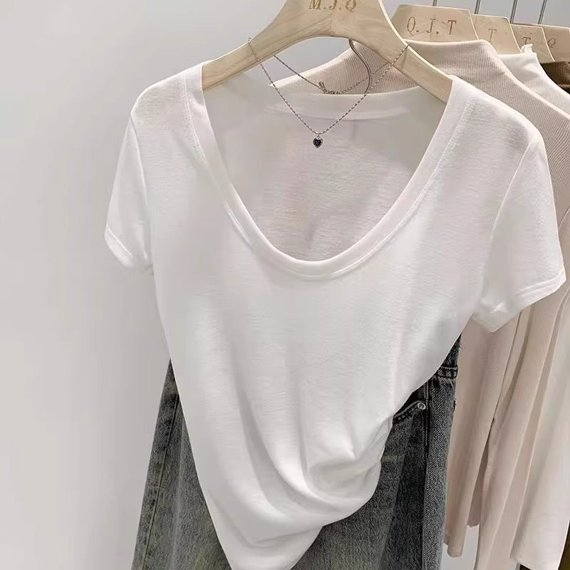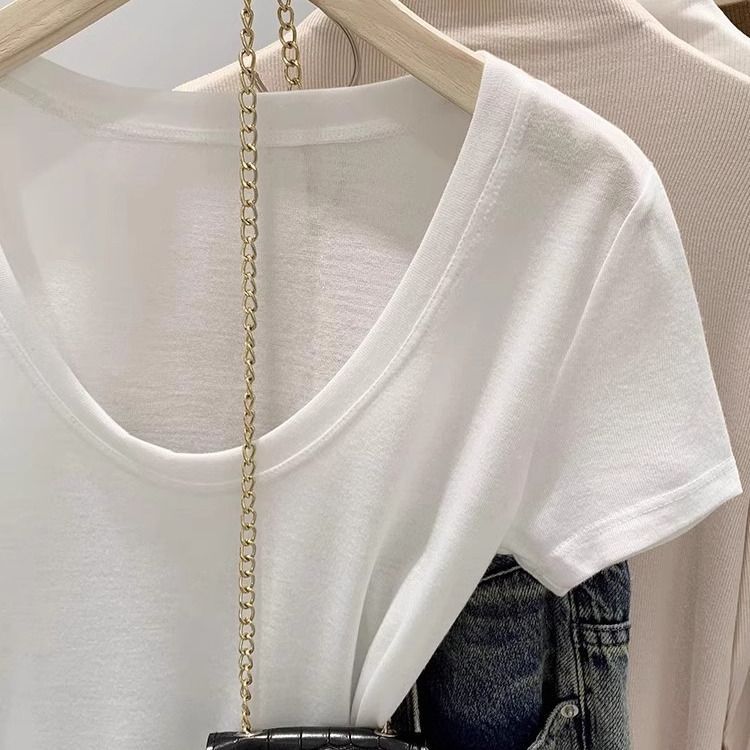 白色正肩大U领短袖t恤女夏季新款显白基础款弹力修身显瘦上衣