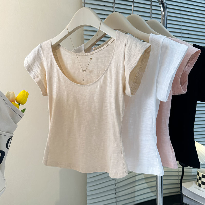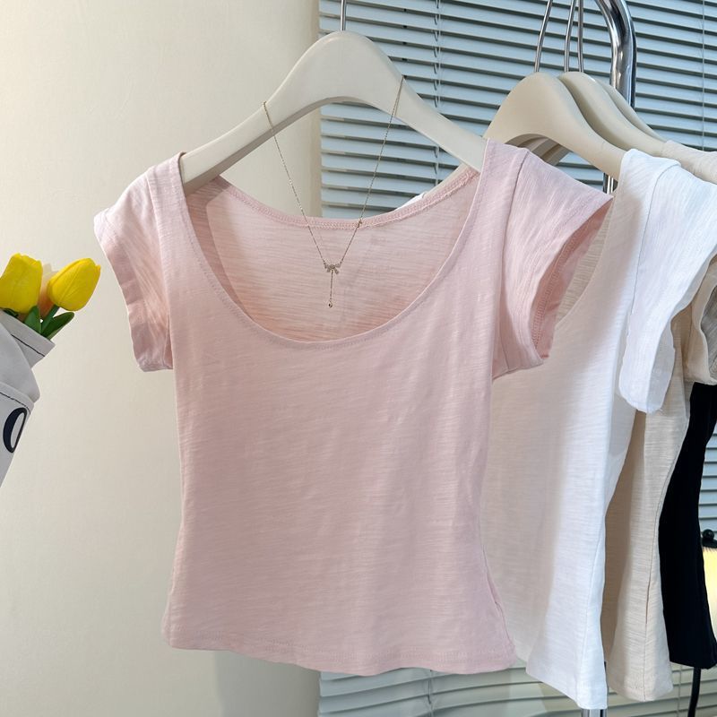 韩系甜辣妹U领百搭短袖T恤女装夏季修身显瘦慵懒风短款正肩上衣潮