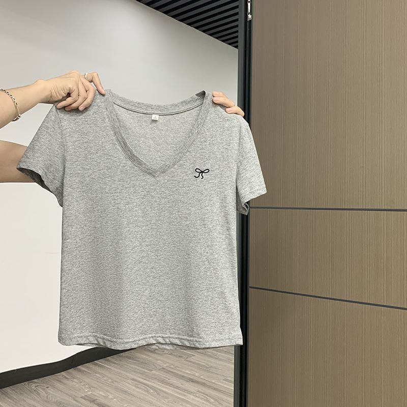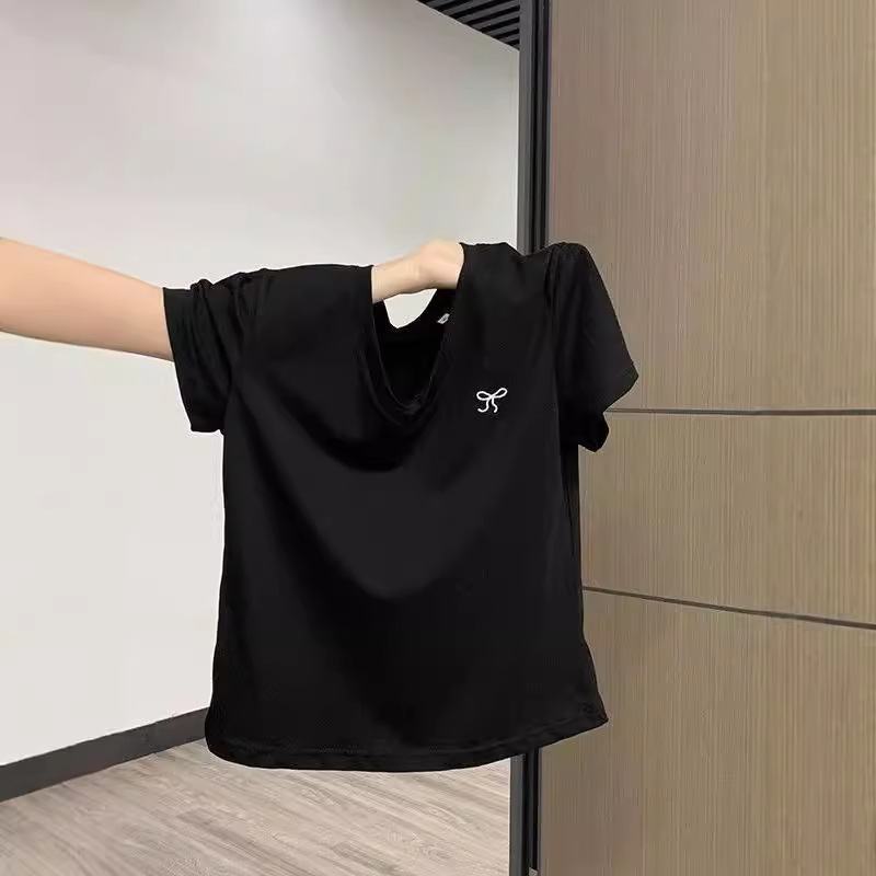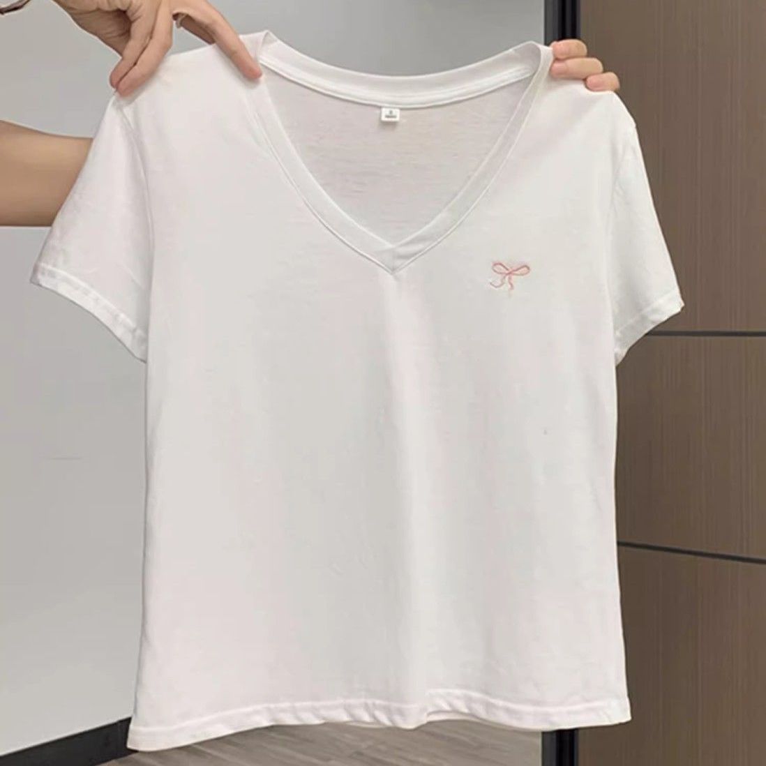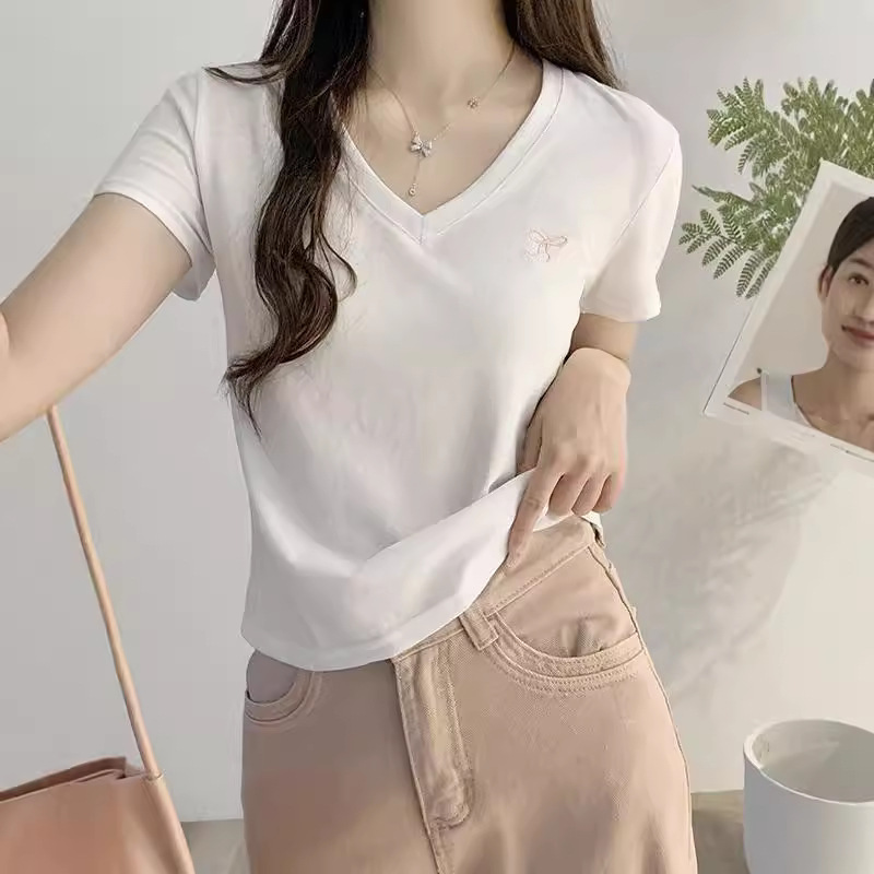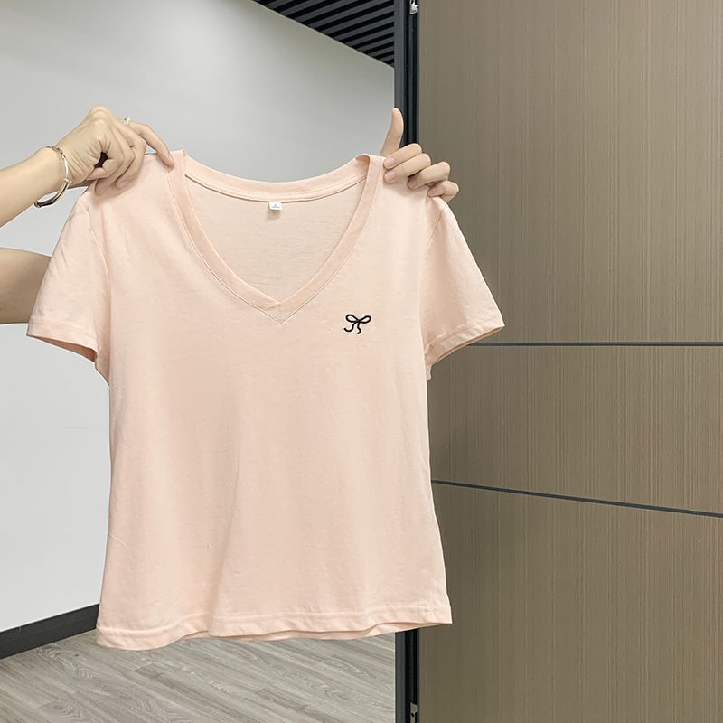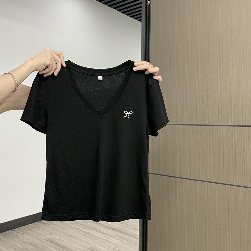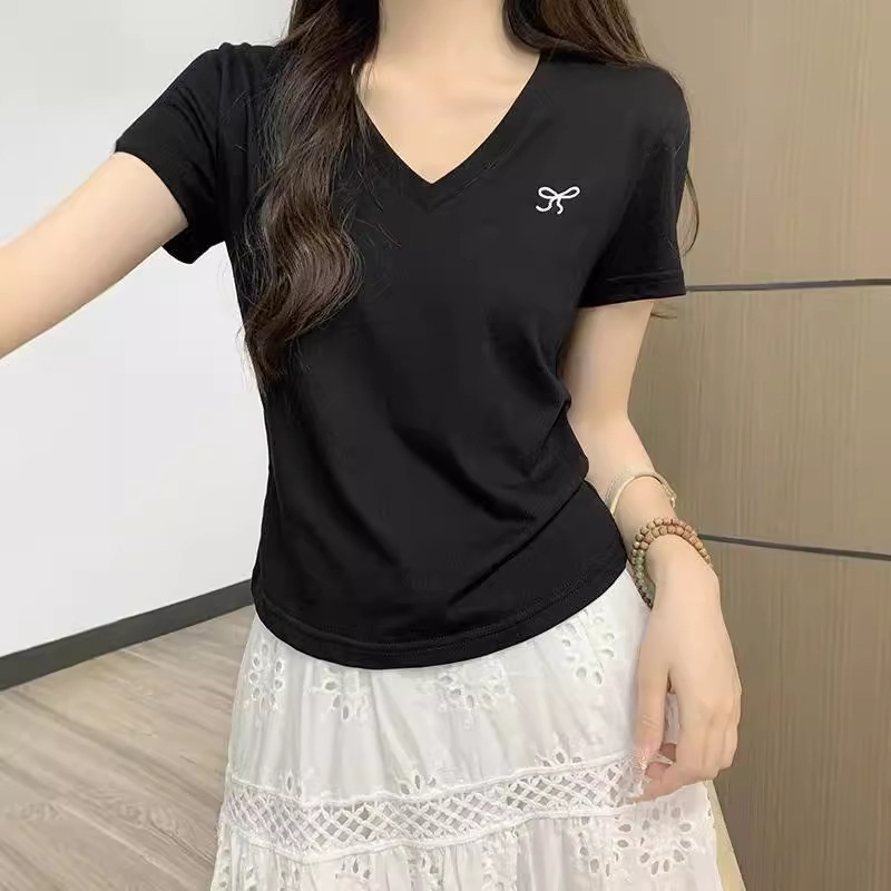 黑色修身V领短袖T恤女夏季收腰显瘦蝴蝶结刺绣小个子通勤别致上衣