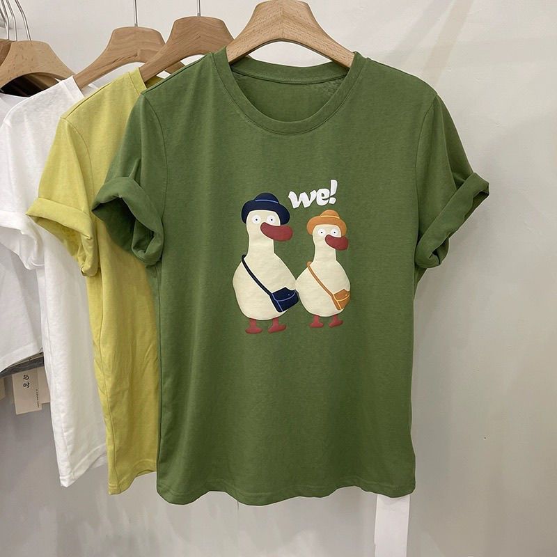 QDF-夏季新款韩版圆领宽松百搭气质鸭子洋气印花短袖T恤女上衣潮