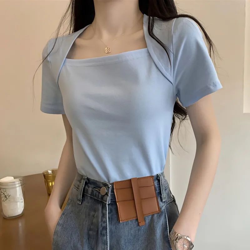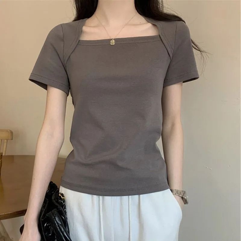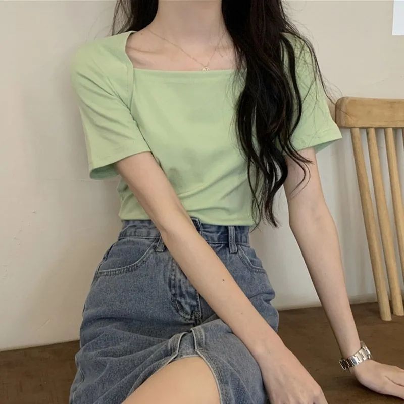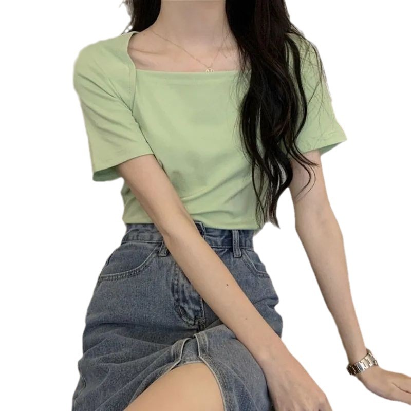 夏季方领辣妹短袖显瘦遮肉T恤女大码正肩别致不规则短款上衣ins潮