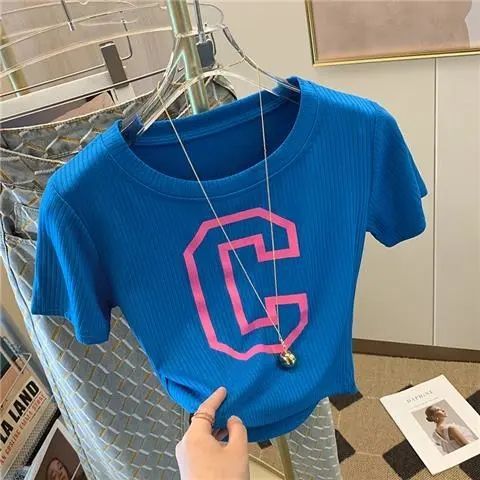 韩版圆领撞色小众设计感短袖T恤女夏季新款修身显瘦百搭上衣