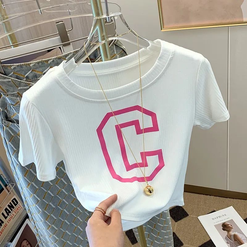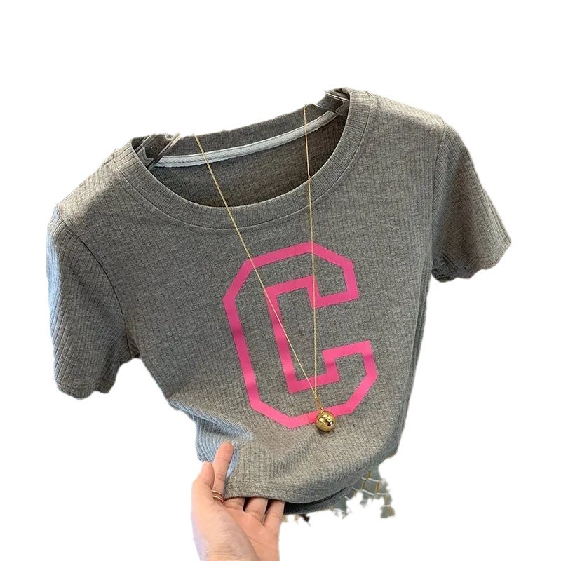 字母印花短款高腰短袖T恤女夏季新款洋气T恤短款修身显瘦上衣