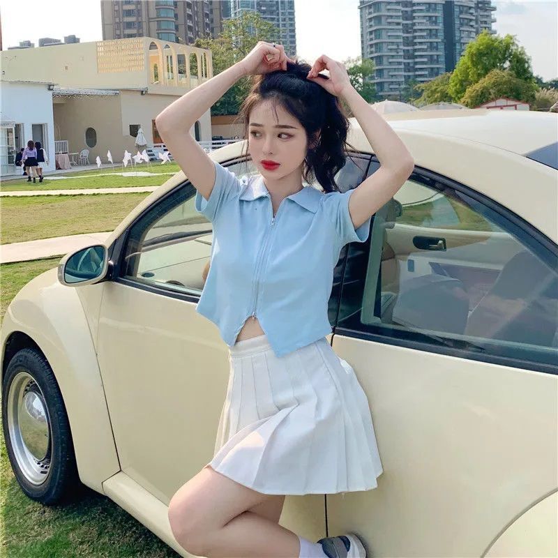 短款设计感双拉链polo领短袖上衣女夏季新款修身显瘦休闲开衫外套