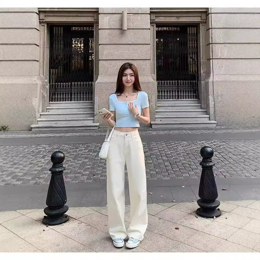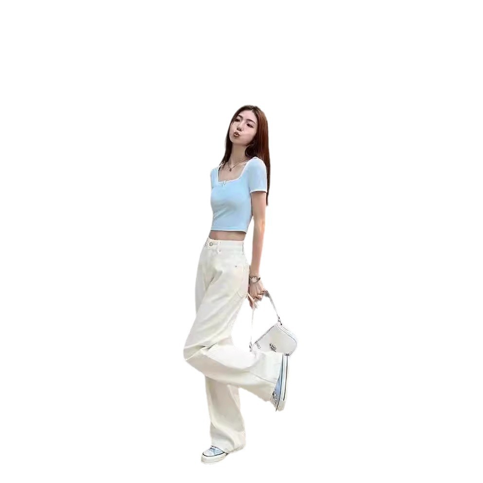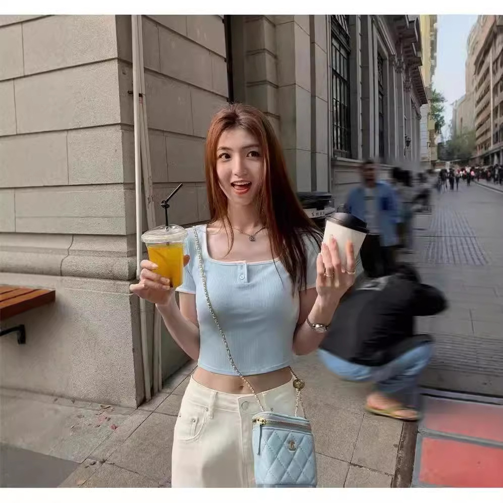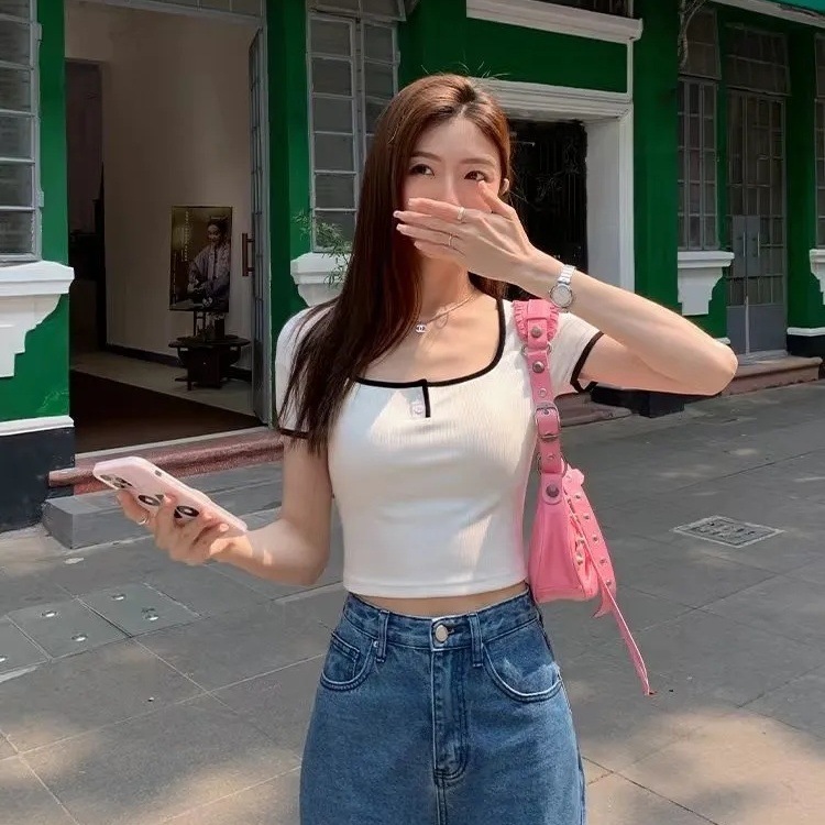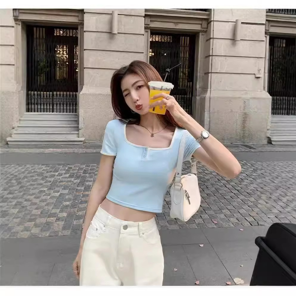 撞色方领短袖t恤女夏新款小众设计感修身显瘦短款甜辣ins上衣