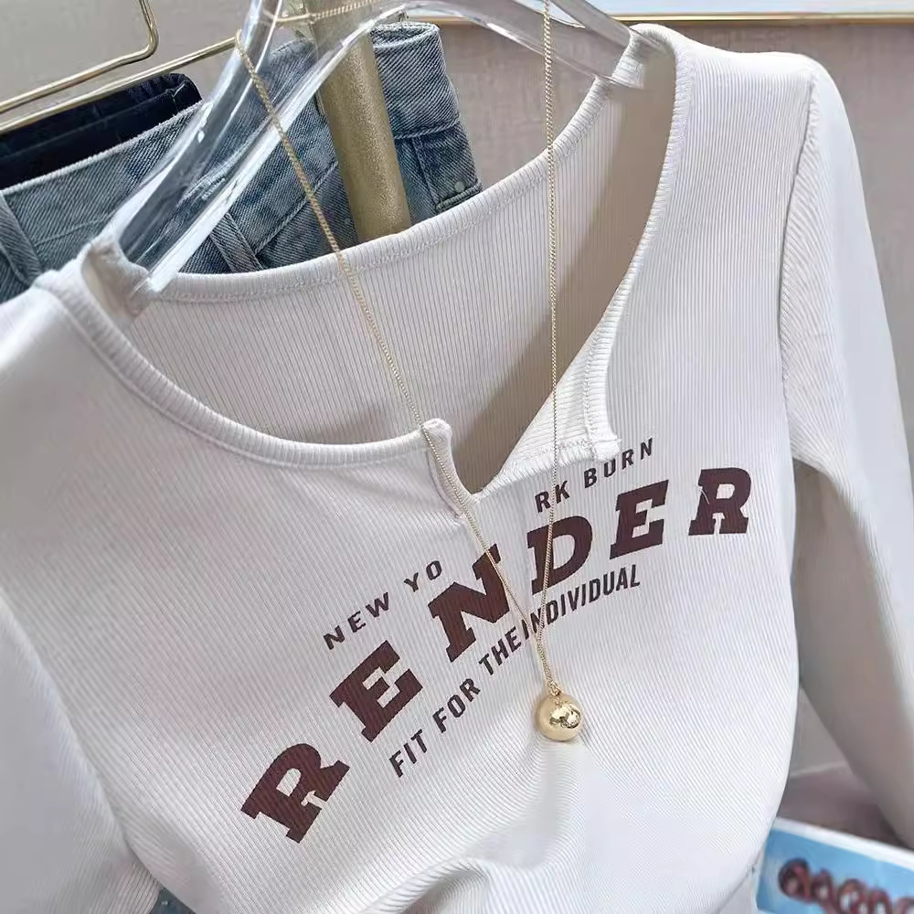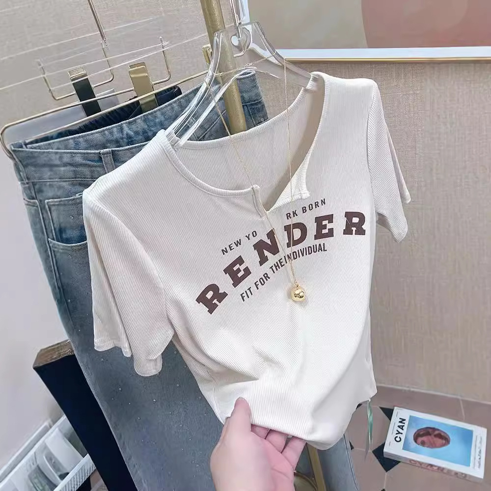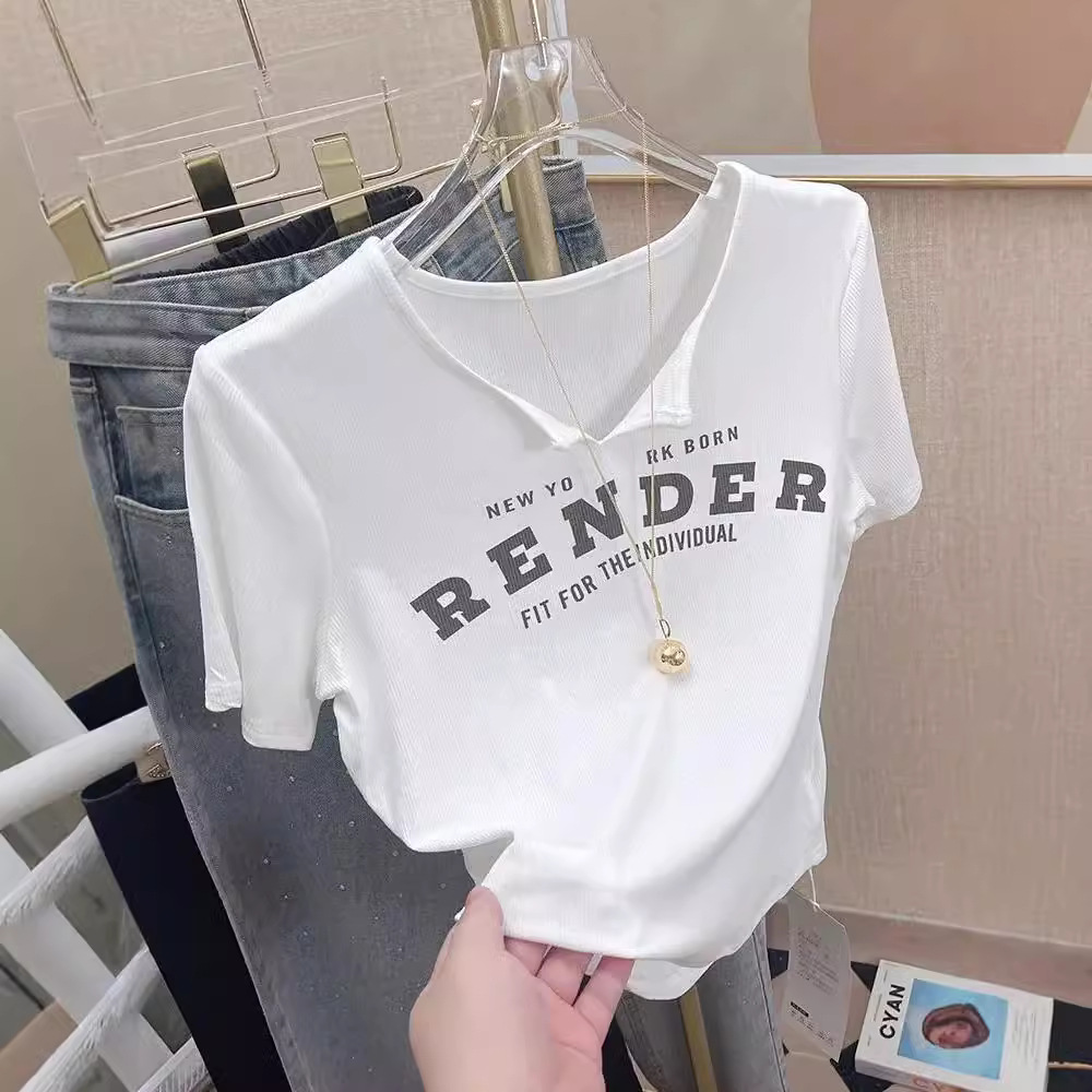 美式复古字母印花v领短袖T恤女夏装韩版新款百搭洋气辣妹短款上衣
