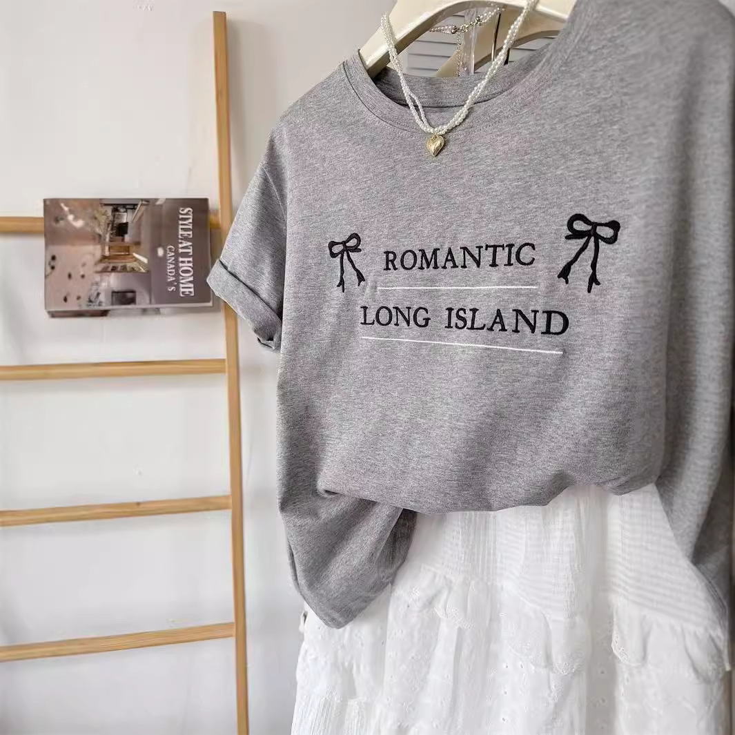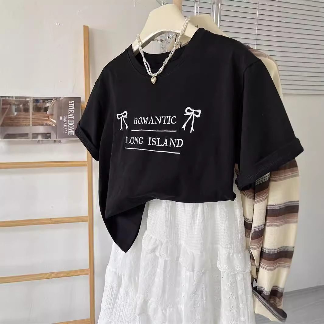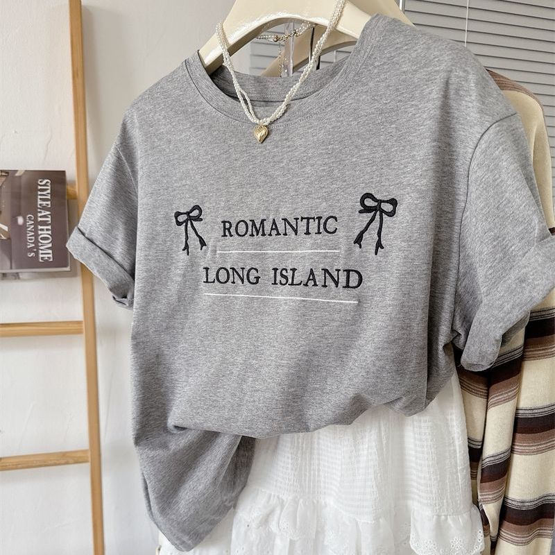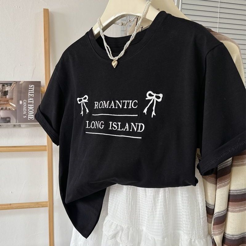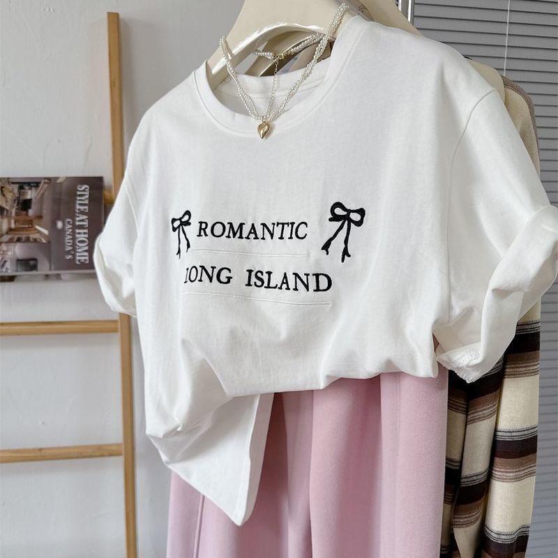 重工刺绣字母蝴蝶结莫代尔短袖T恤女夏季百搭宽松圆领套头上衣潮