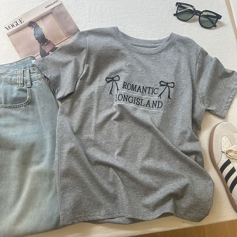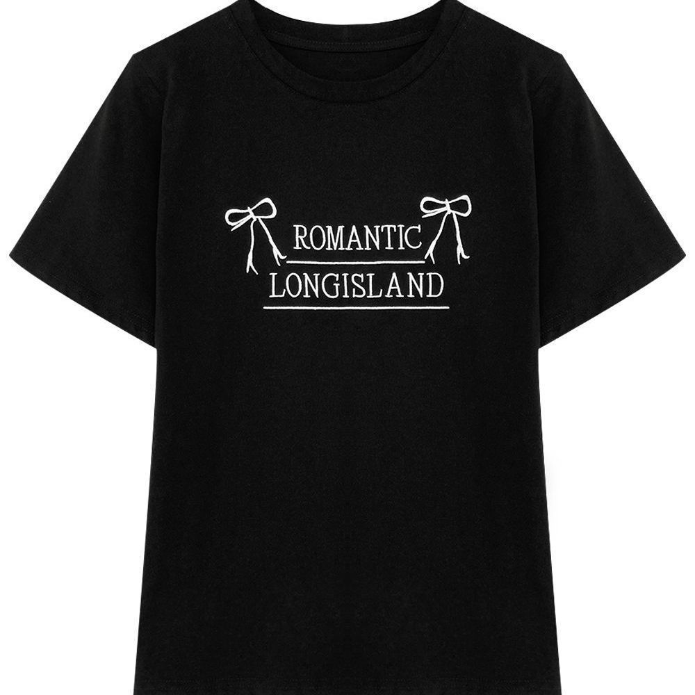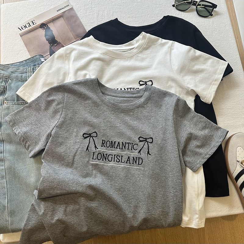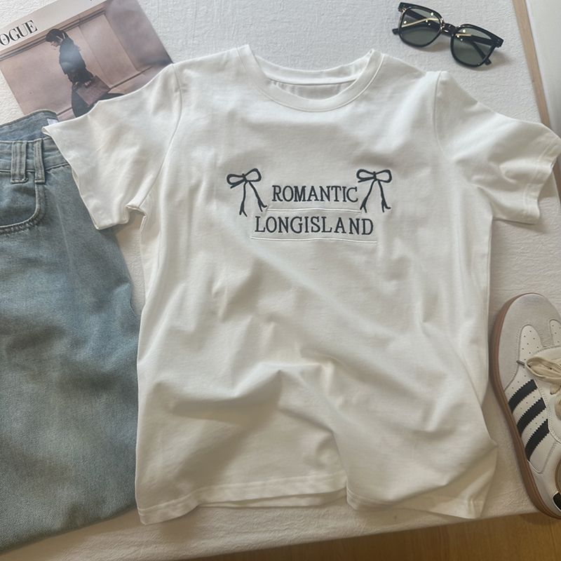 韩系蝴蝶结英文刺绣短袖t恤女夏季新款ins宽松显瘦洋气通勤上衣潮