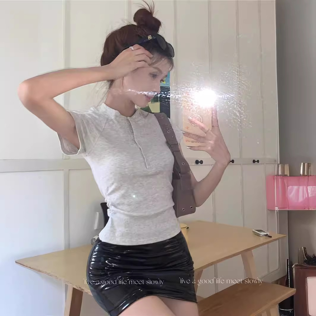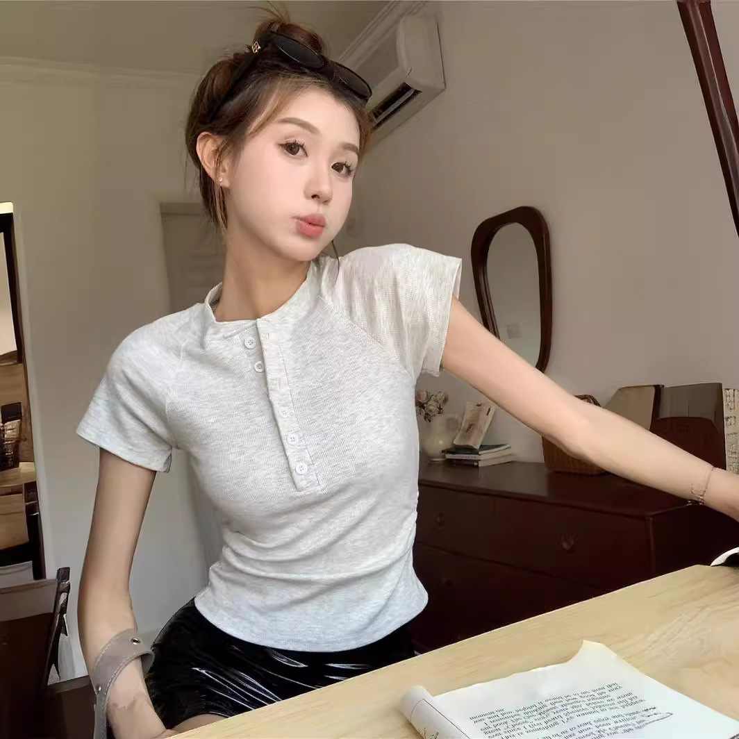 李火火美式辣妹排扣立领短款紧身上衣女夏季设计感短袖T恤ins