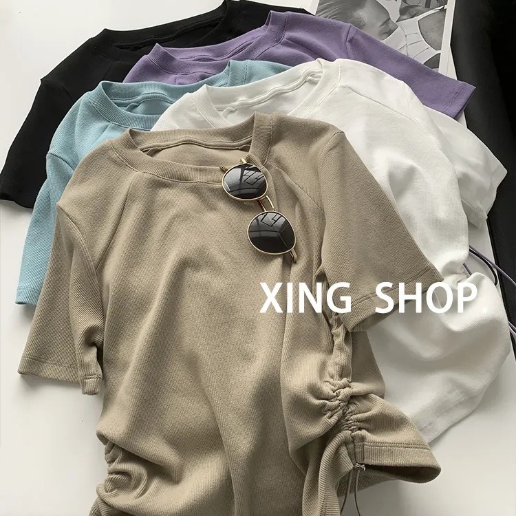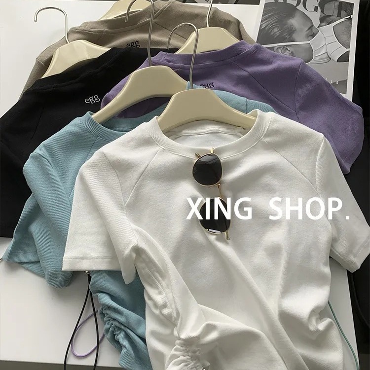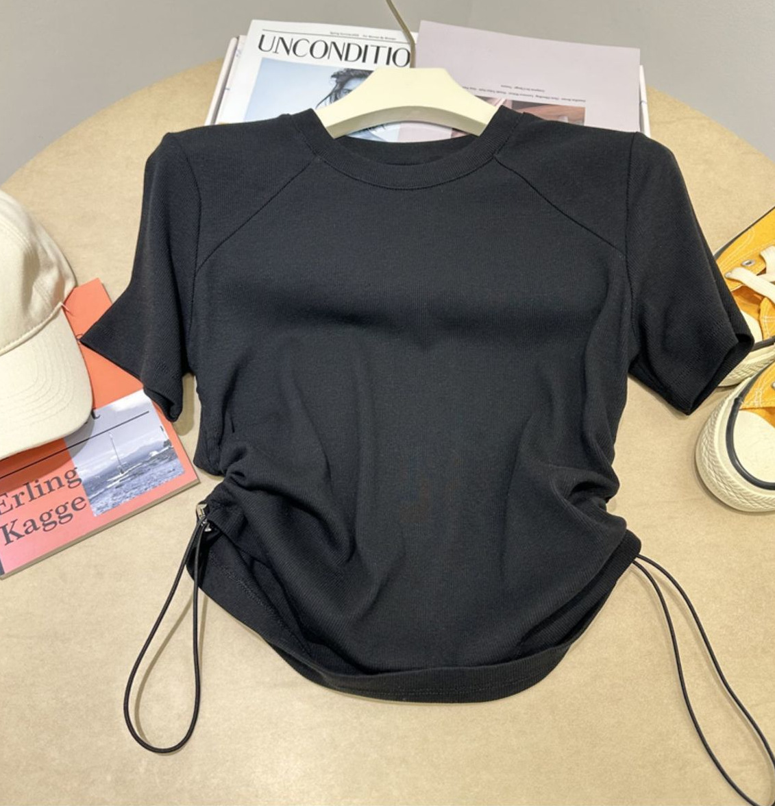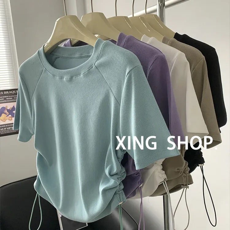 紫色正肩t恤女夏夏季设计感小众收腰抽绳短款小个子短袖体恤上衣