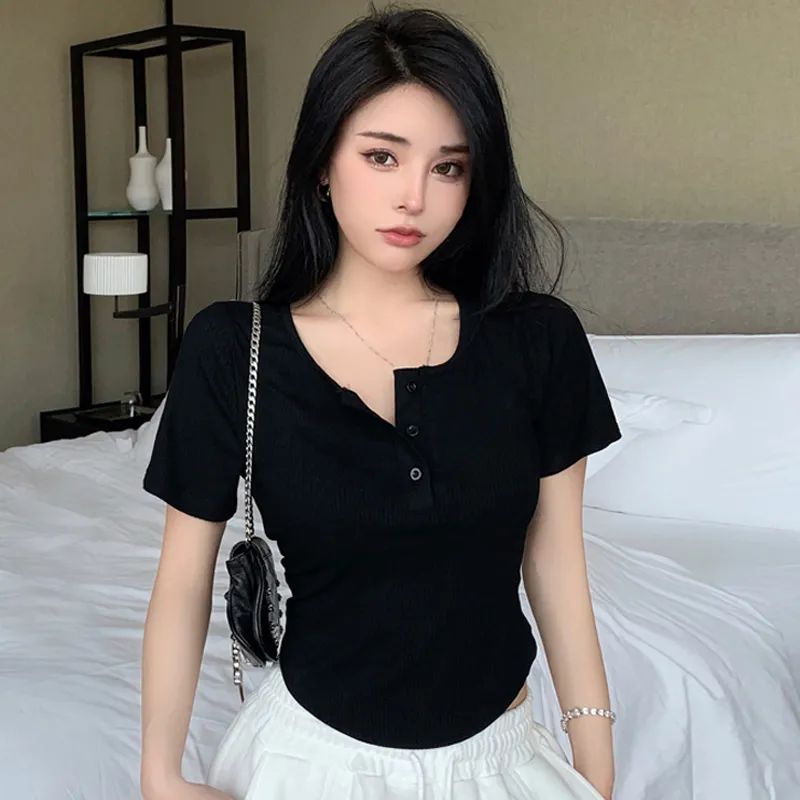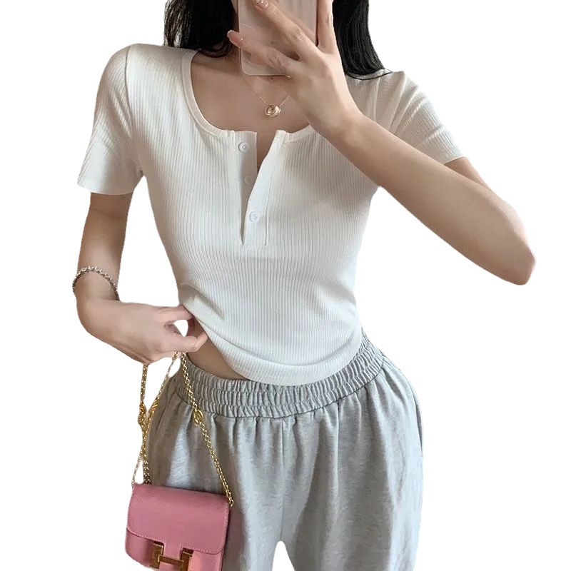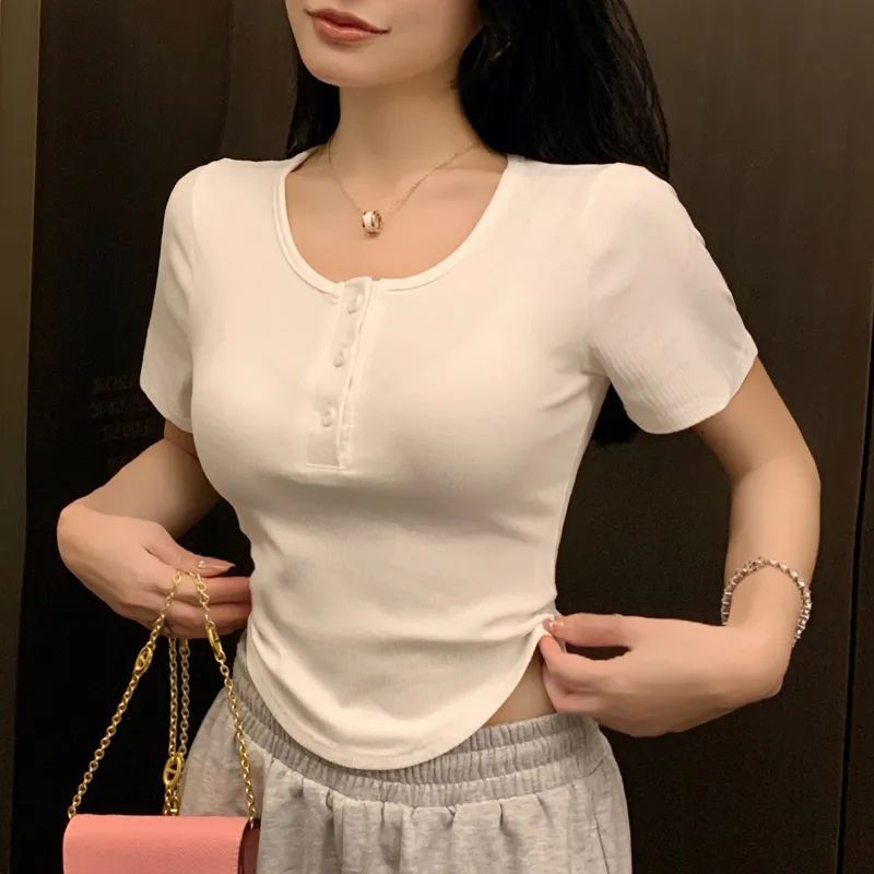 夏韩版百搭圆领设计感正肩短袖T恤女上衣美式洋气修身半纽扣