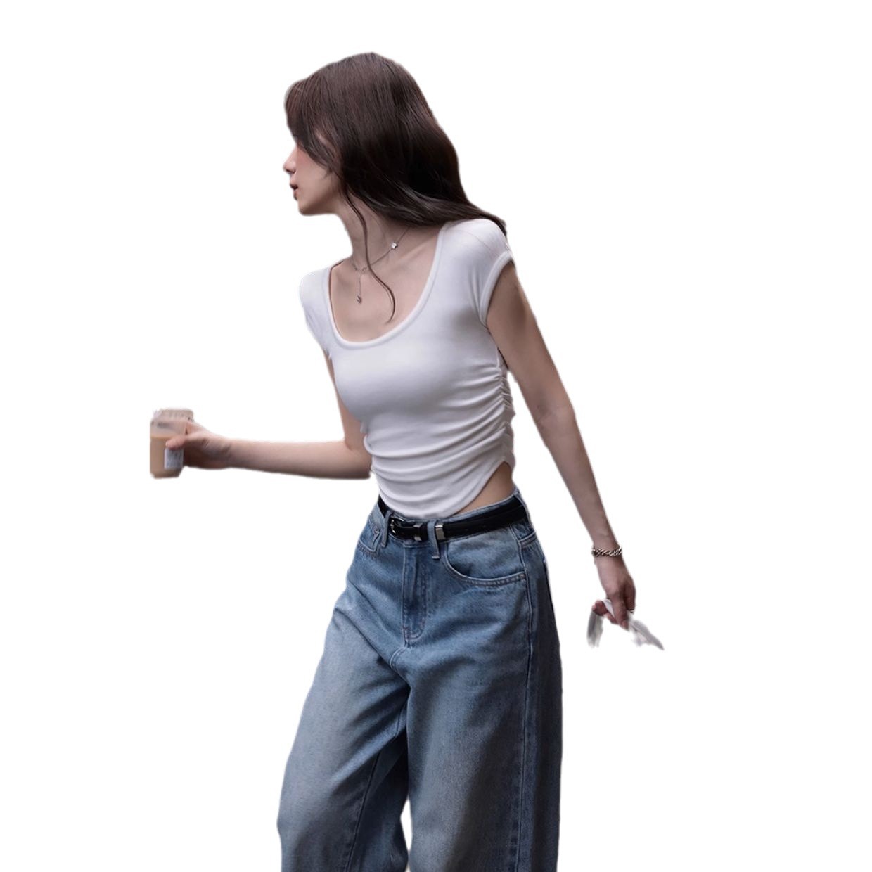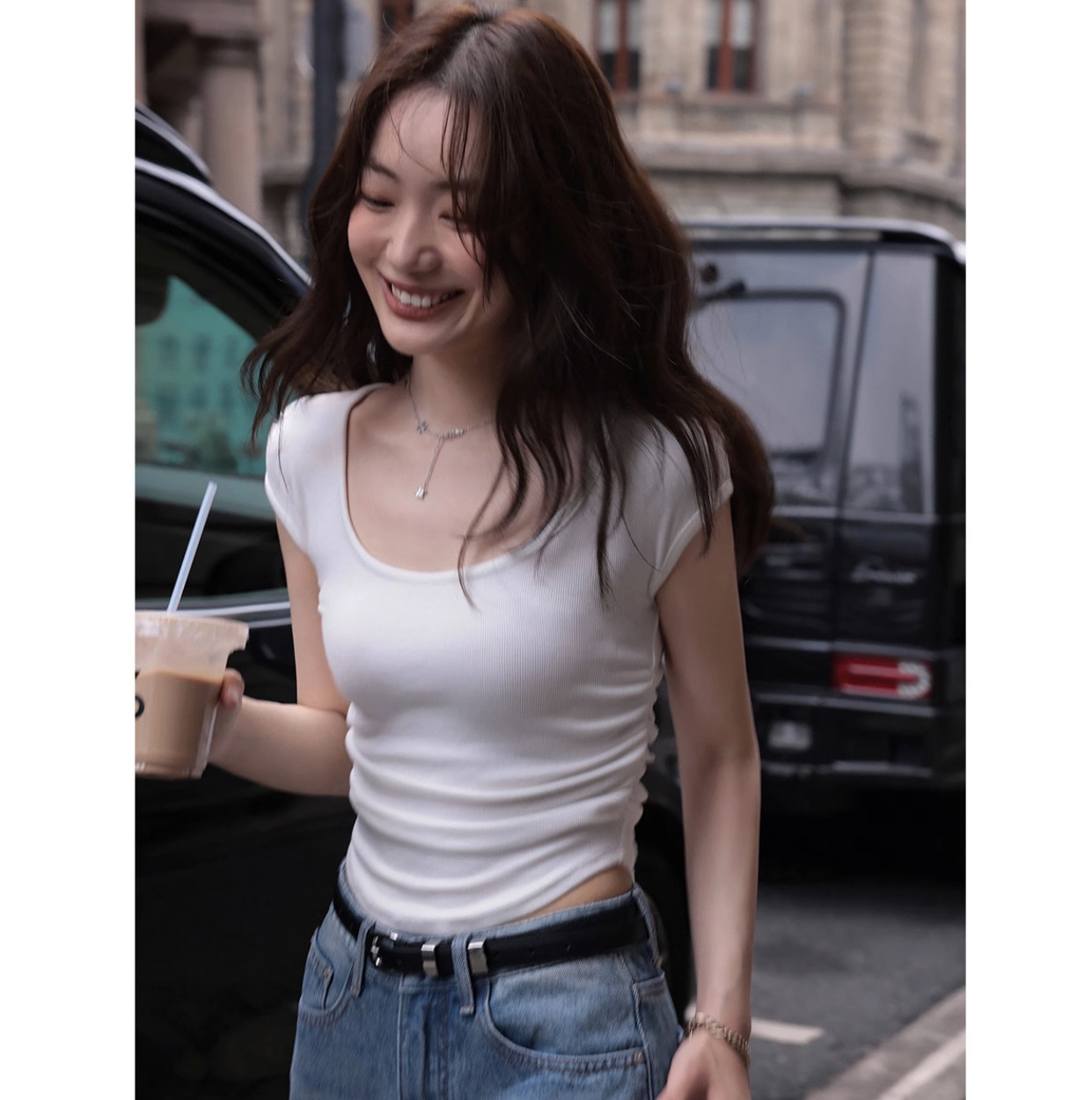 莫代尔纯欲修身显瘦抽褶锁骨短袖T恤女夏季短款纯色简约U领上衣