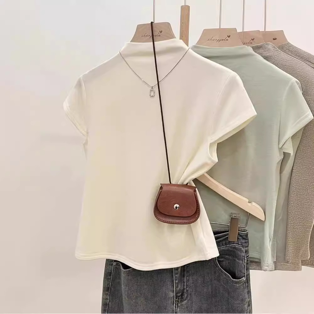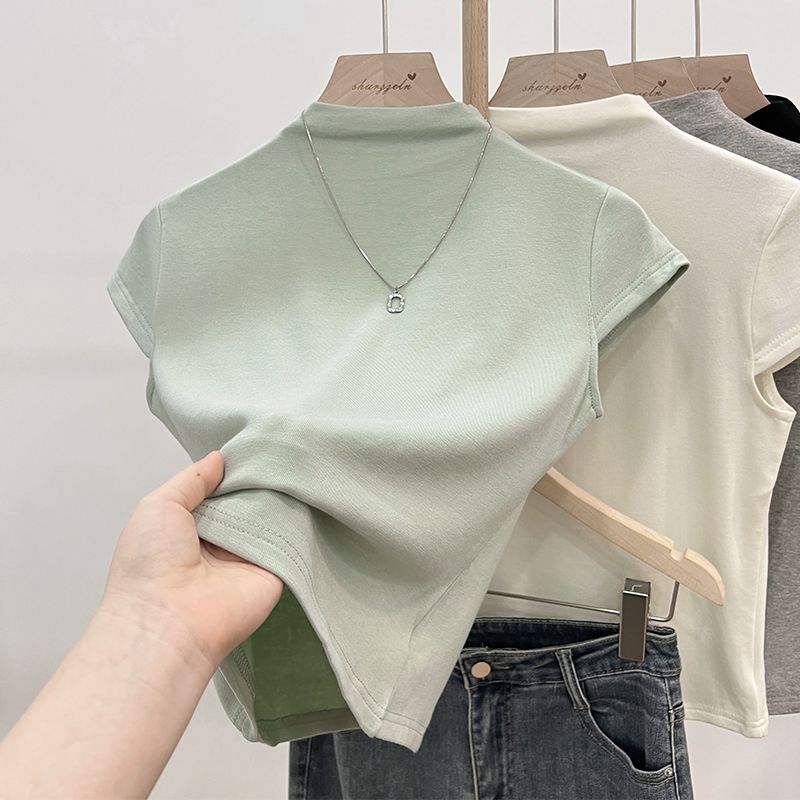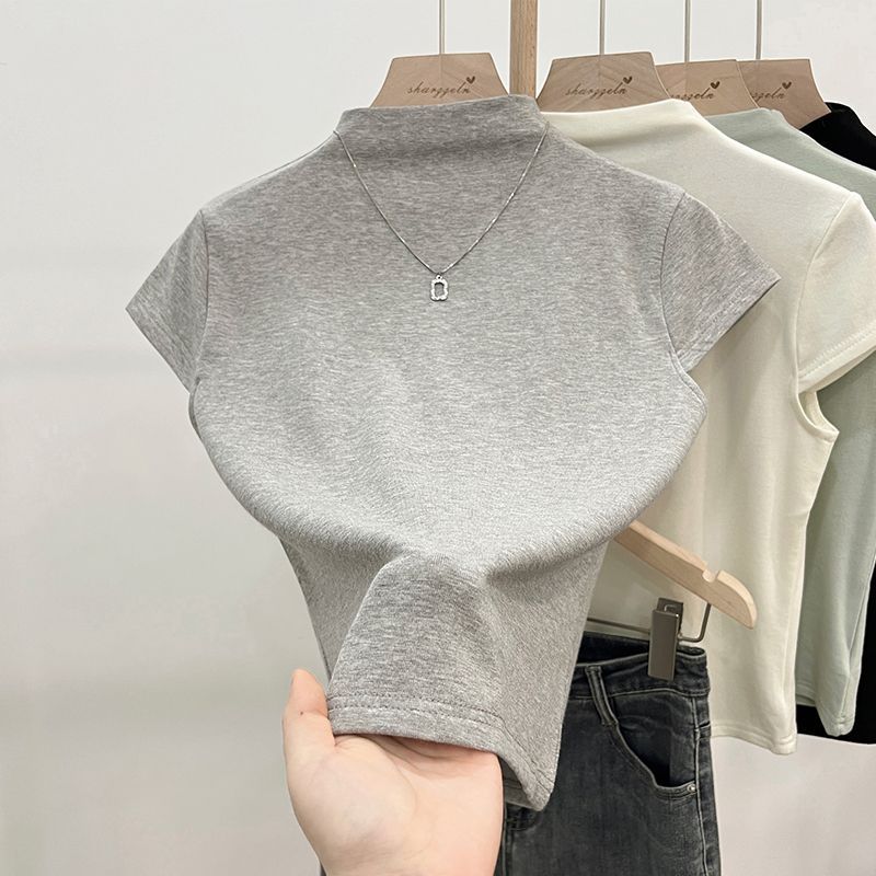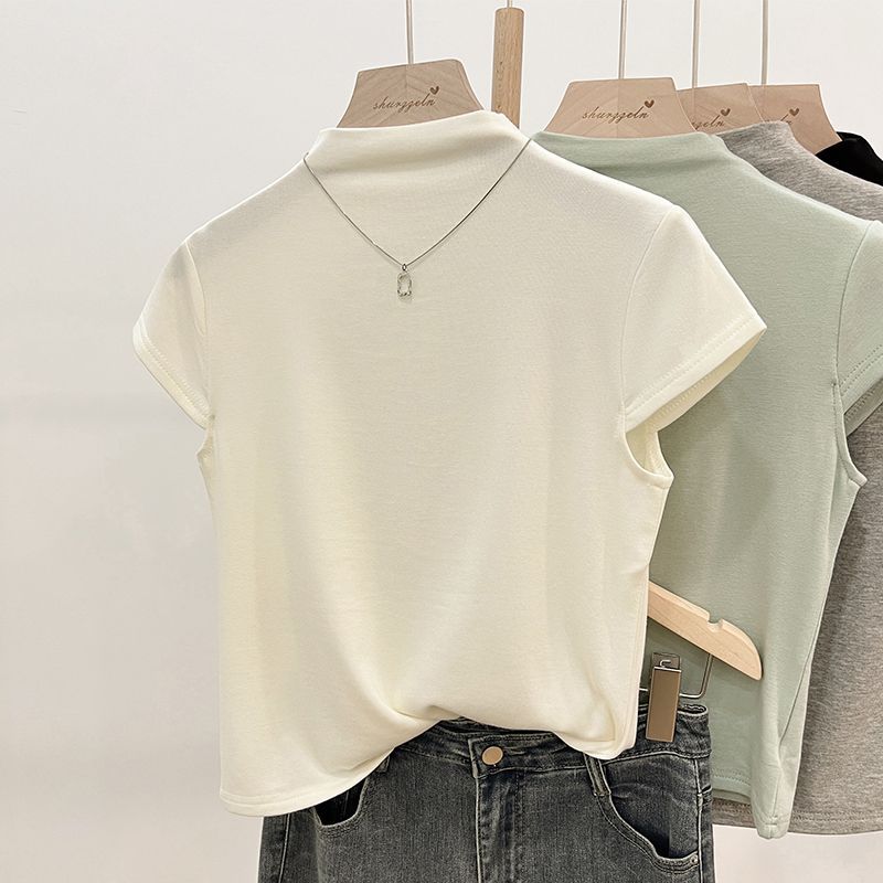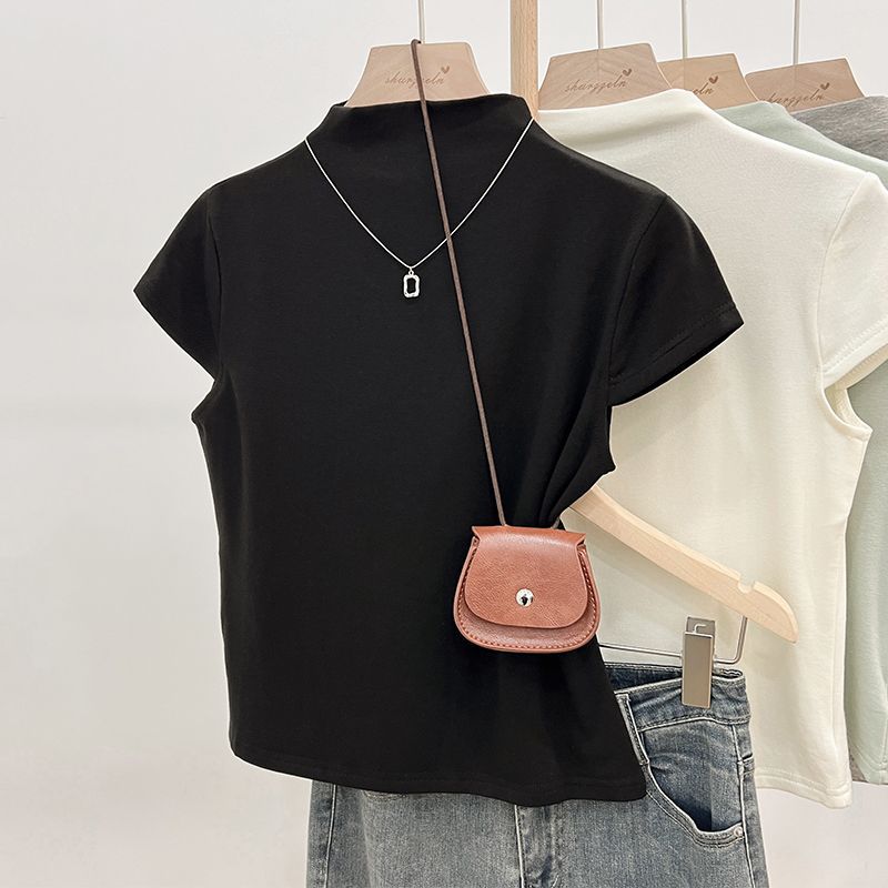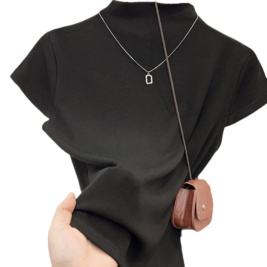 纯棉半高领正肩短袖T恤女 新款气质修身上衣潮内搭基础打底衫