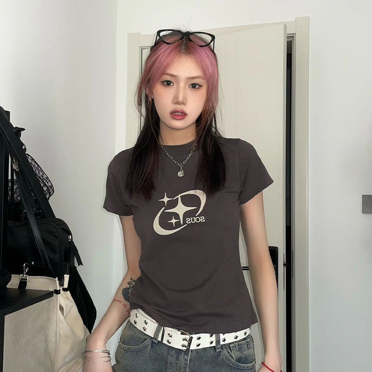 美式复古修身正肩短袖t恤女夏季新款韩版百搭修身辣妹上衣服