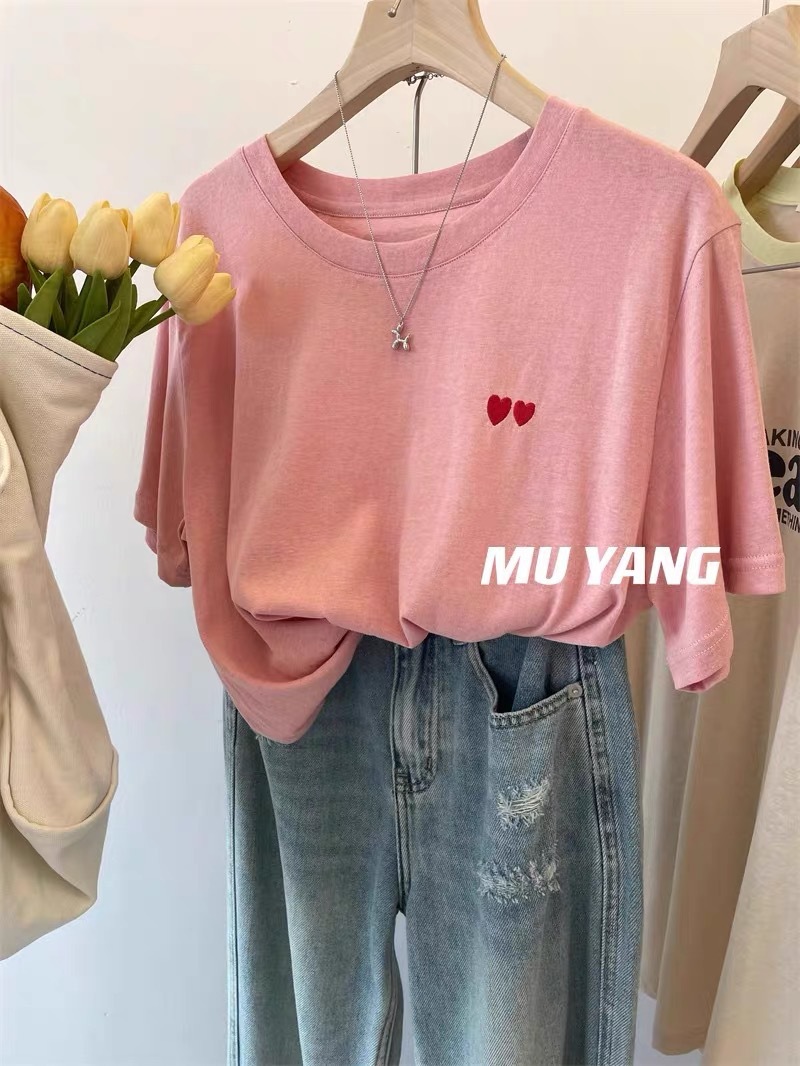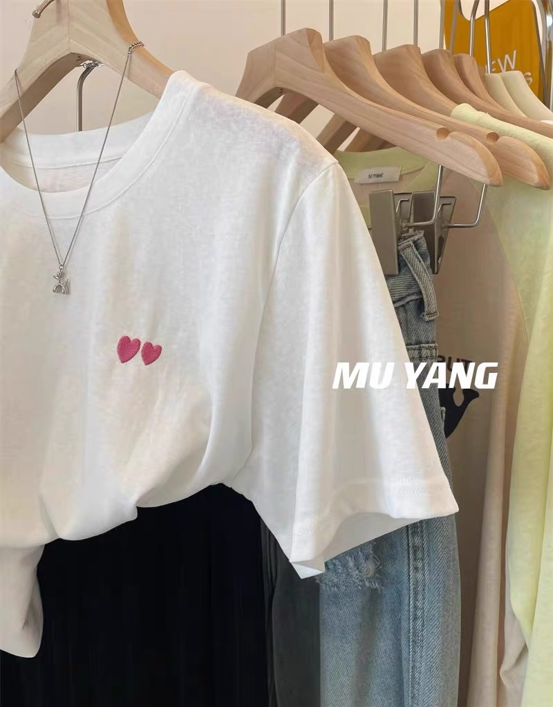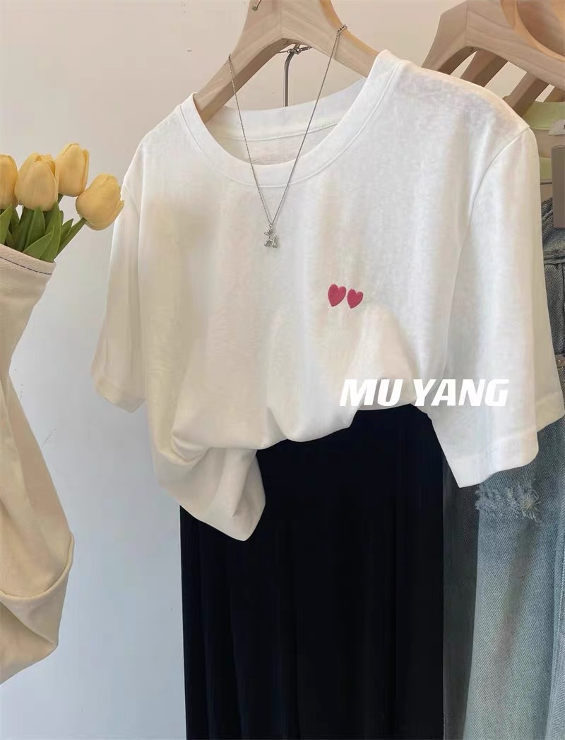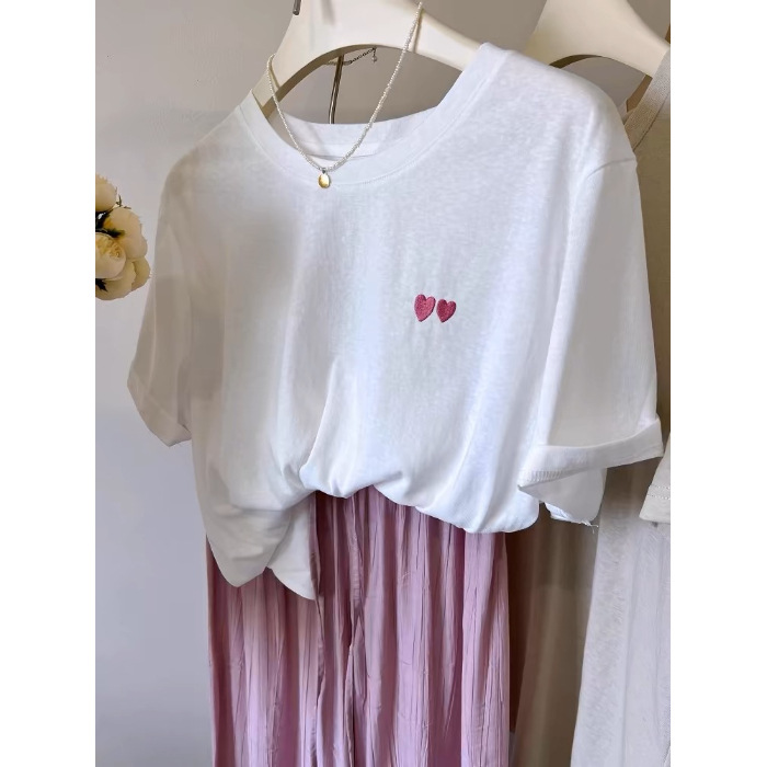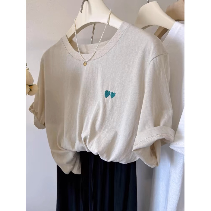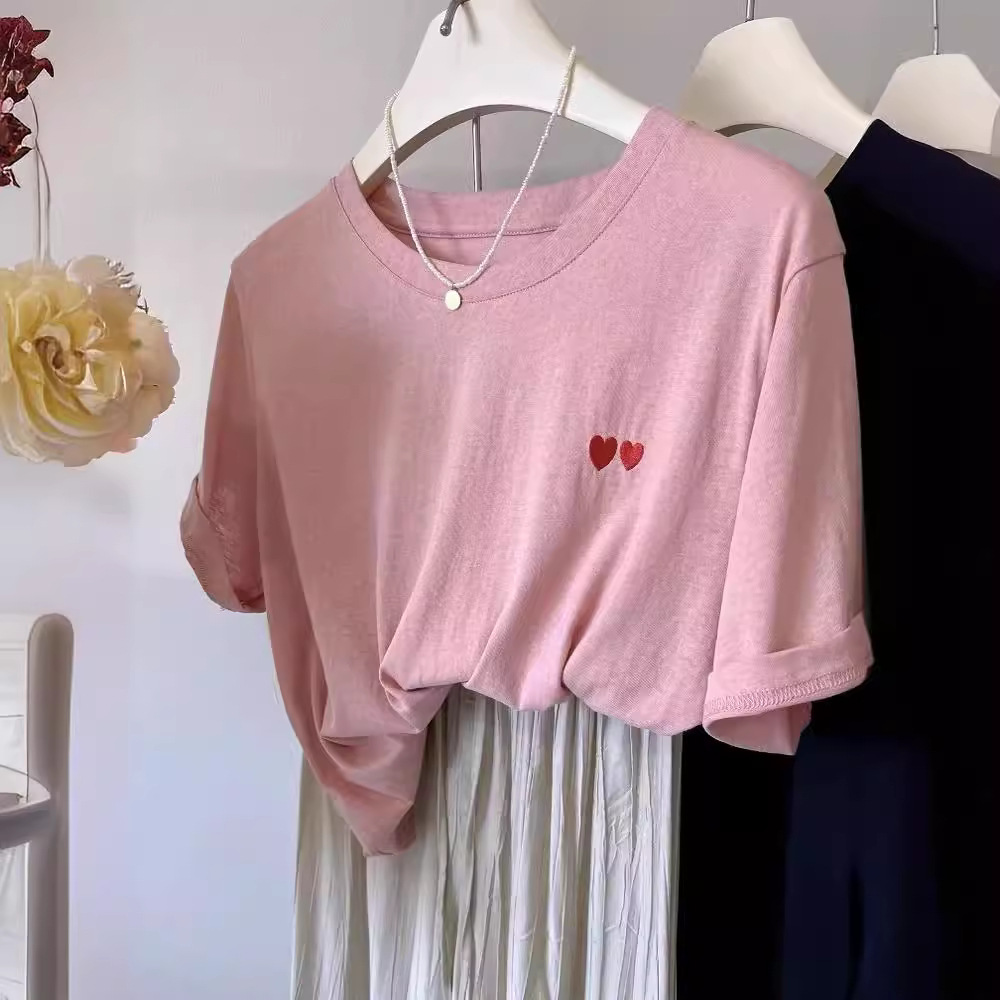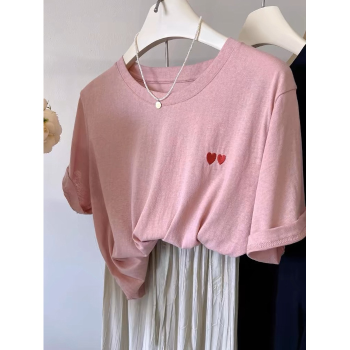 轻薄透气雪花棉爱心刺绣T恤女宽松休闲百搭圆领短袖上衣夏季新款