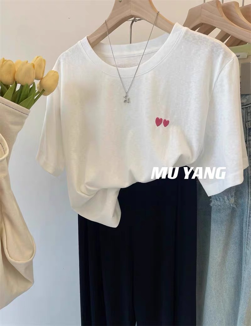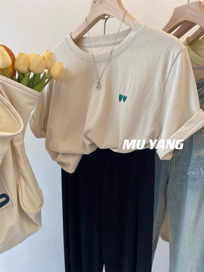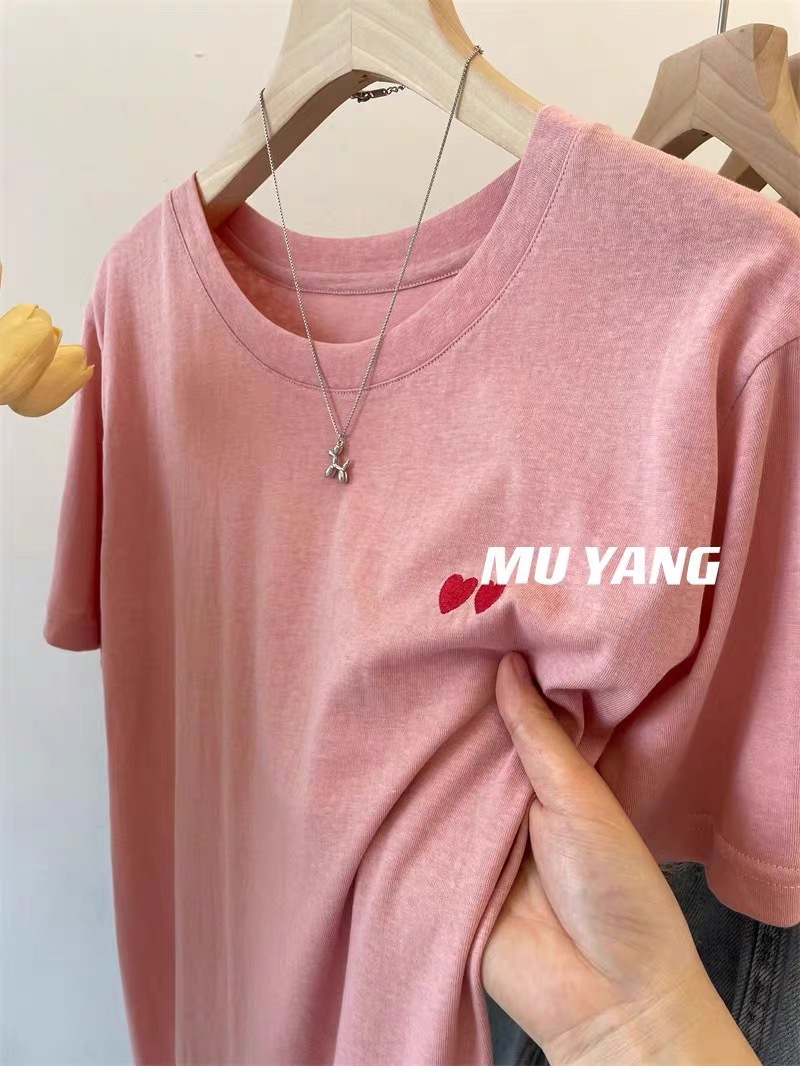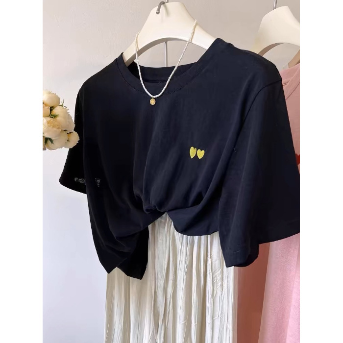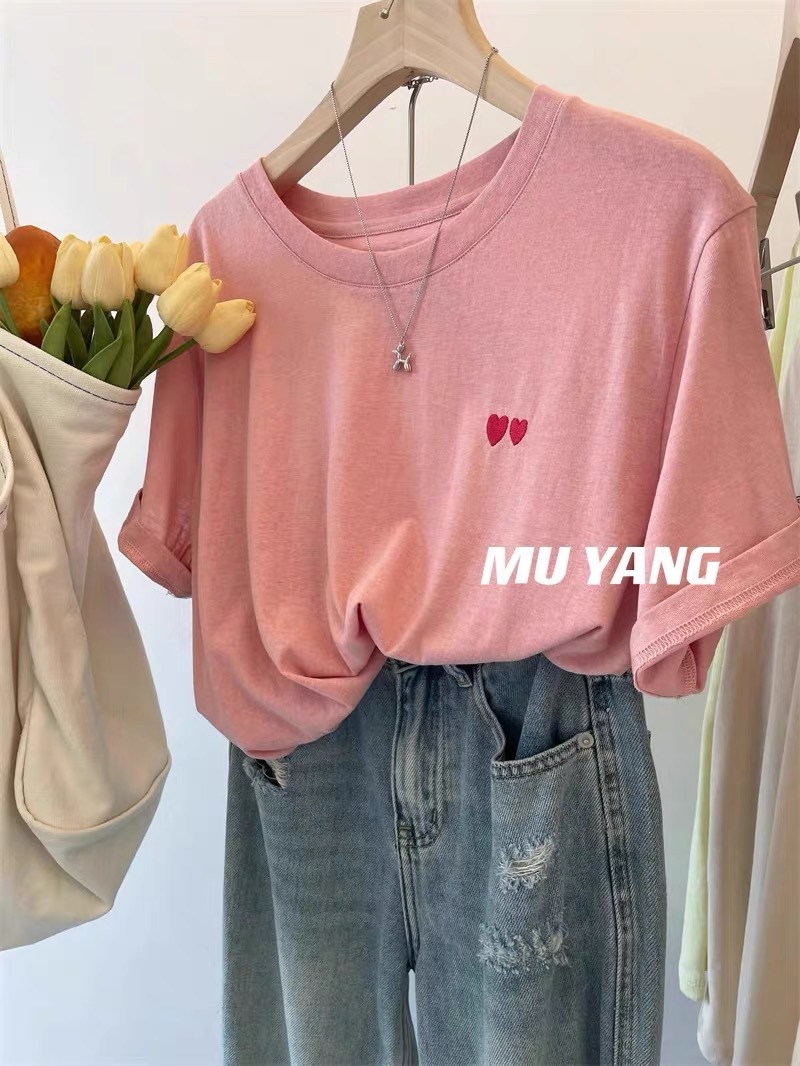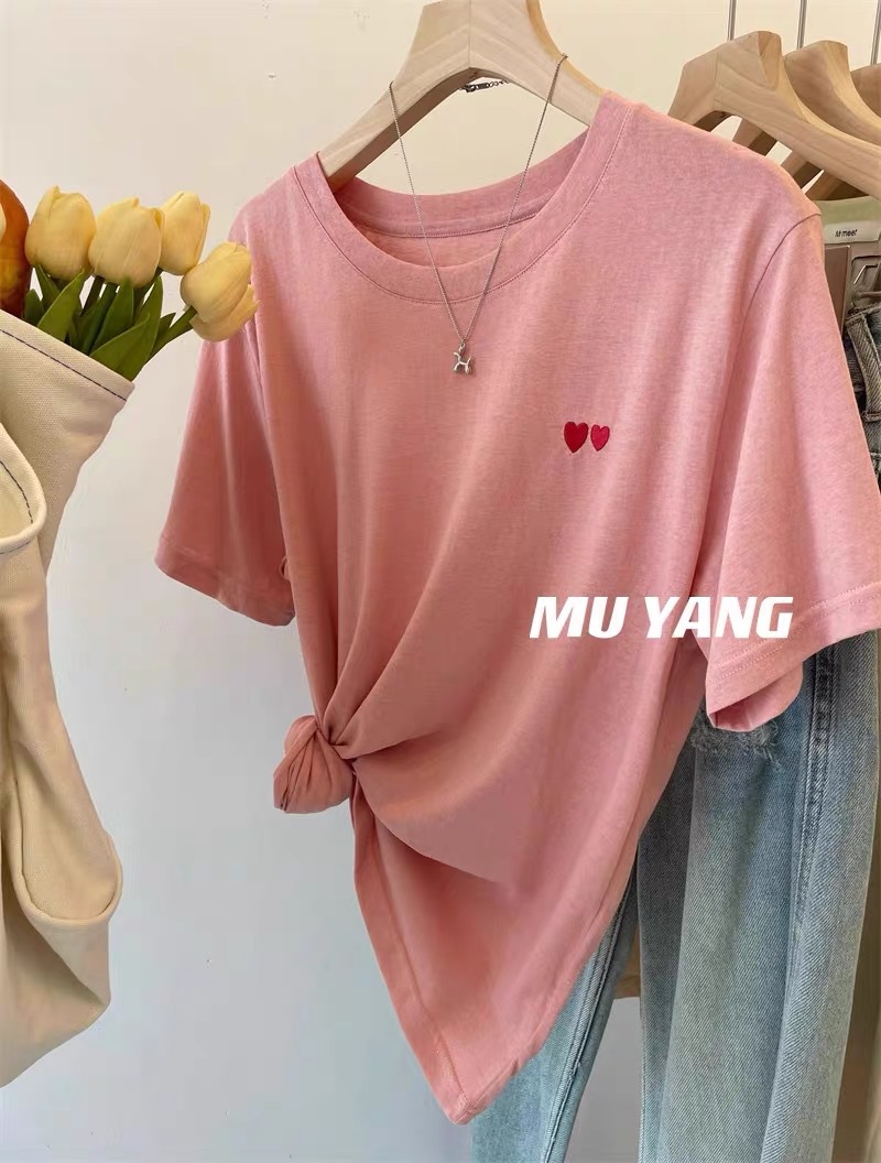 轻薄透气雪花棉爱心刺绣T恤女宽松休闲百搭圆领短袖上衣夏季新款